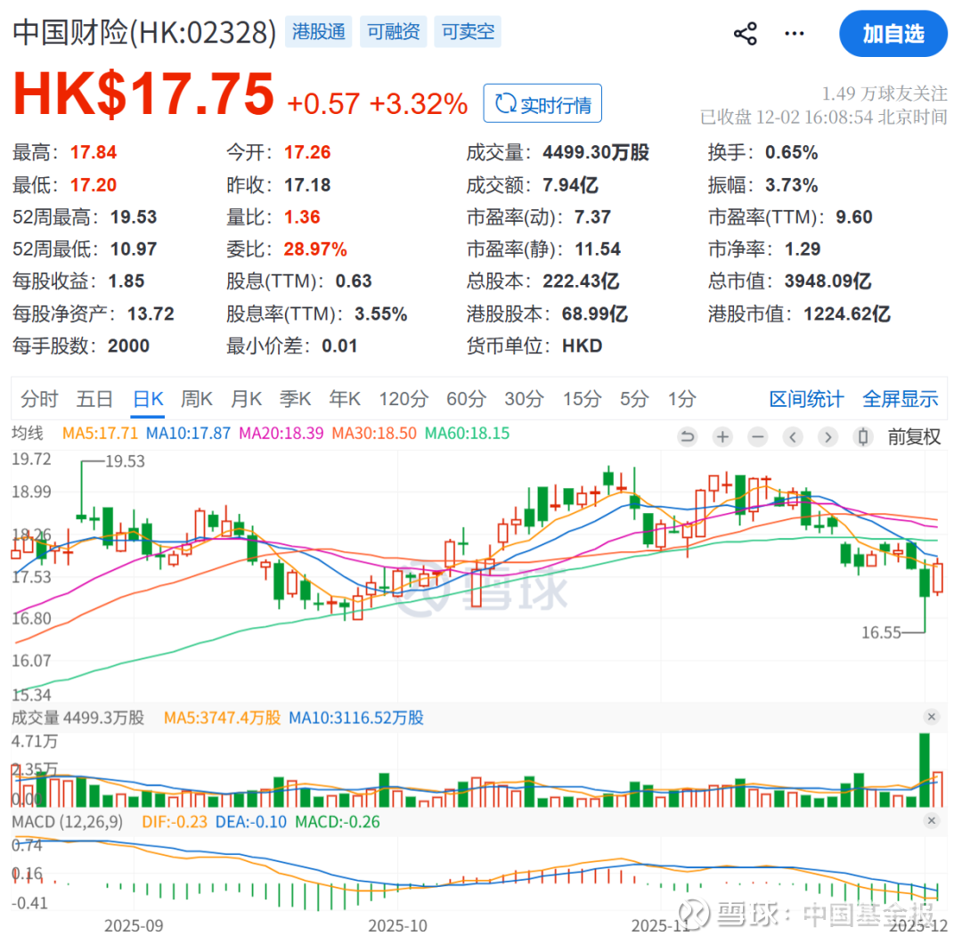 12月2日,港股中国财险股价有所回升,截至收盘报17.75港元/股,总市值为3948.09亿港元。