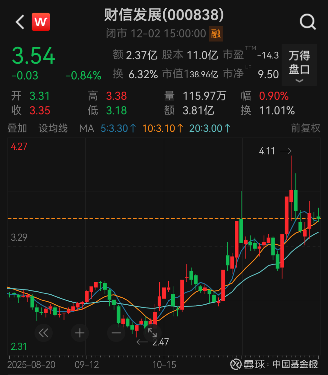 12月2日,财信发展股价以3.54元/股收盘,最新市值为38.96亿元。