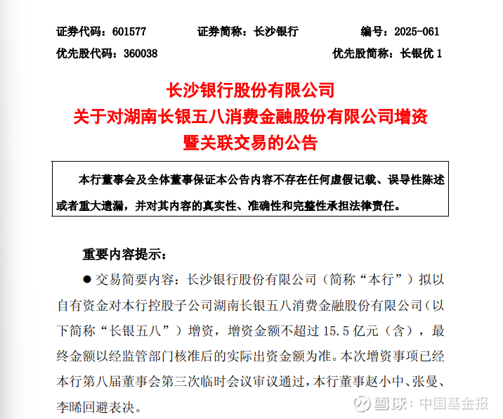 长沙银行公告显示,拟以自有资金对长银五八消金增资不超过15.5亿元(含),最终金额以监管部门核准为准,本次增资旨在提升该消金的资本实力和风险抵御能力,推动其可持续发展。