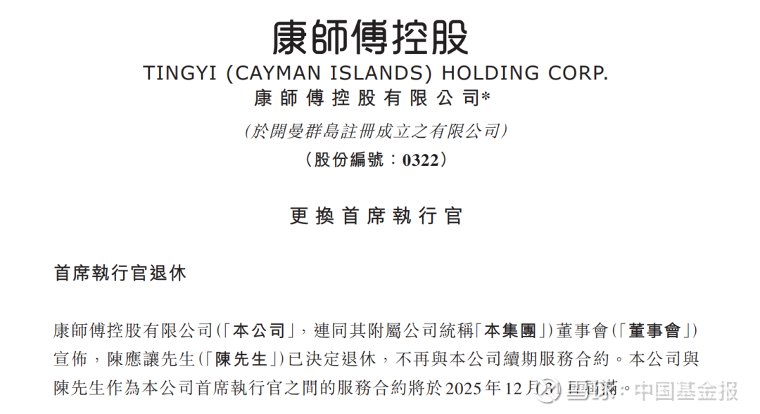 【导读】康师傅将于2026年1月1日更换首席执行官