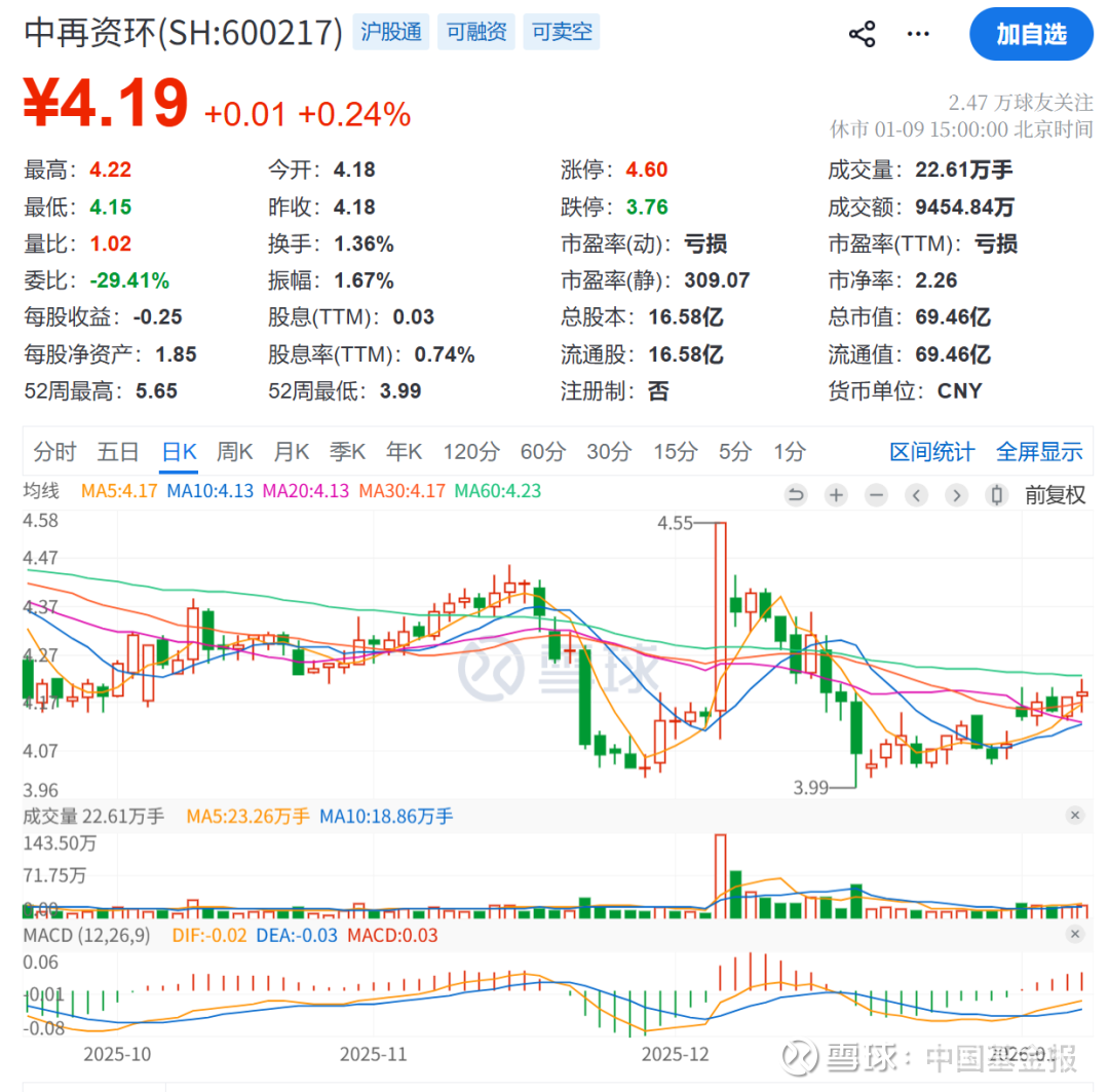 截至1月9日收盘,中再资环股价为4.19元/股,总市值仅有69亿元。