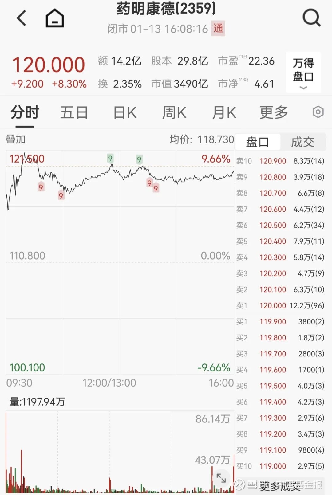 1月13日,药明康德股价高开高走,一度大涨9.66%;全天收于120港元/股,涨8.30%,领涨蓝筹。药明康德股价大涨的主要原因,是公司1月12日发布盈利预告称,公司2025年归母净利润预计同比增长约102.65%。
