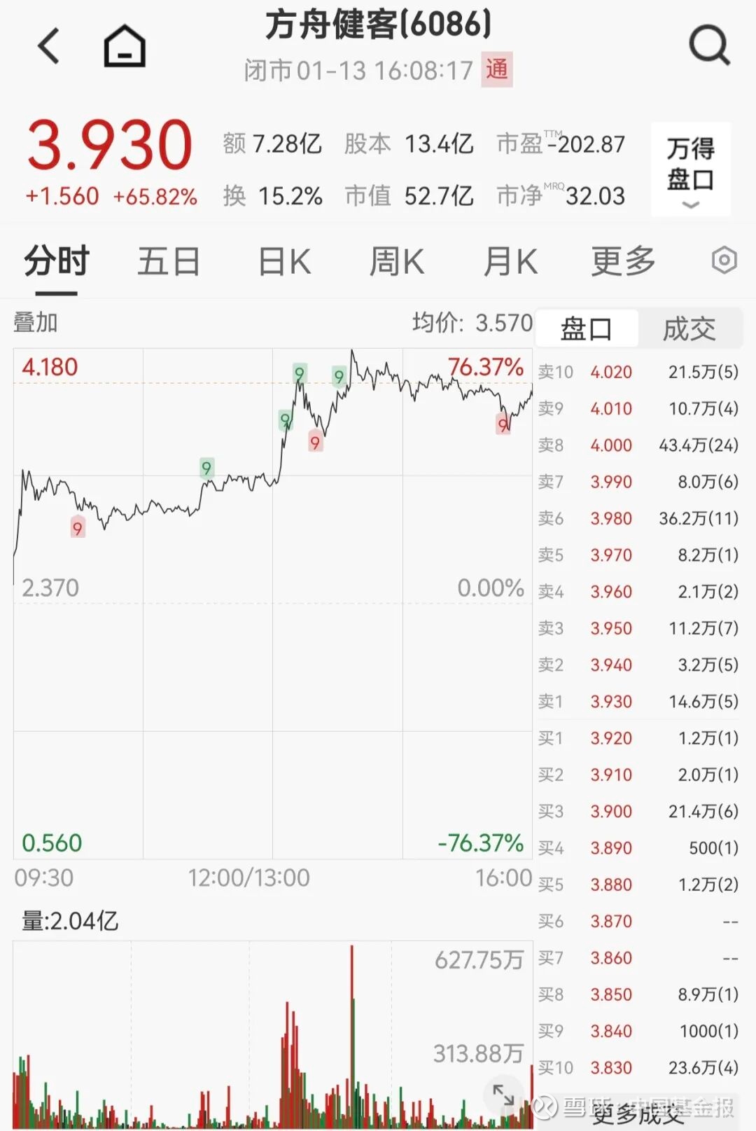 方舟健客开盘后狂飙,最高涨幅达76.37%;全天收于3.93港元/股,大涨65.8%。公司近期携手腾讯健康数智化升级“AI+慢病管理”领域技术。