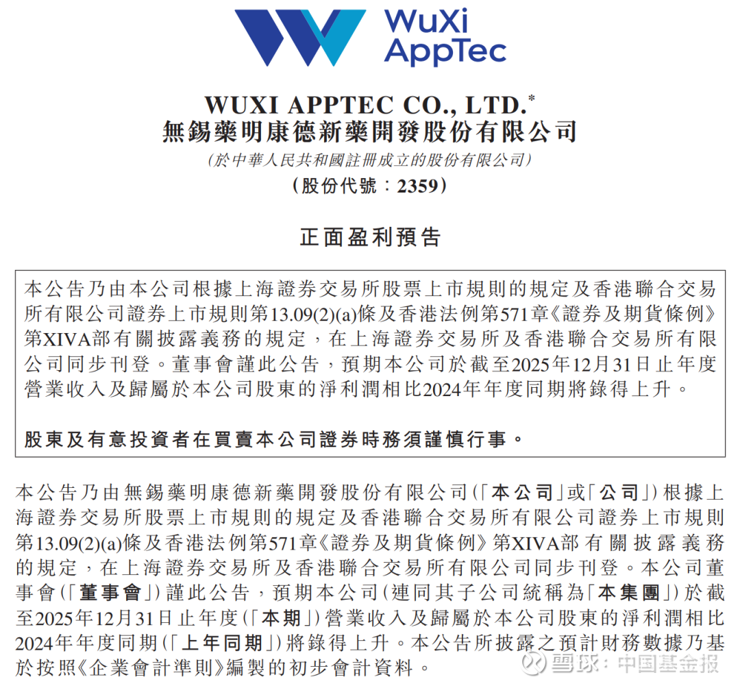 1月12日,药明康德发布《正面盈利预告》,预计公司2025年度营业收入约为454.56亿元,同比增长约15.84%,其中持续经营业务收入同比增长约21.40%。公司预计经调整归母净利润约为149.57亿元,同比增长约41.33%;扣除非经常性损益的归母净利润约为132.41亿元,同比增长约32.56%;归母净利润预计约为191.51亿元,同比增长约102.65%;利润总额预计约为239.06亿元,同比增长约107.16%;基本每股收益预计约为人民币6.70元/股,同比增长约104.27%。