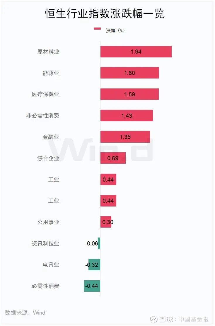 行业表现方面,恒生行业指数中,原材料业指数上涨1.94%,能源业指数上涨1.60%,医疗保健业指数上涨1.59%;跌幅方面,必需性消费行业指数下跌0.44%,电讯业指数下跌0.32%,资讯科技业指数下跌0.06%。
