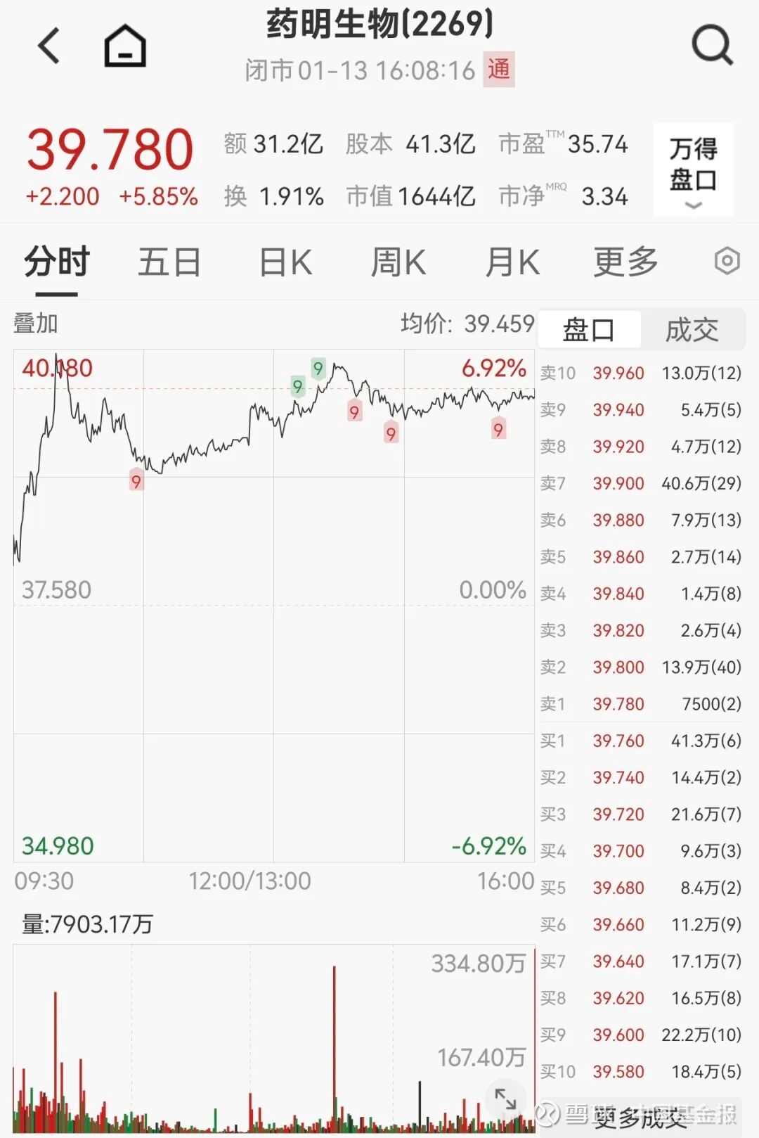 药明系另一只个股药明生物也大幅上涨,最大涨幅达6.92%;全天收于39.78港元/股,涨5.85%,涨幅在蓝筹股中位居第二。