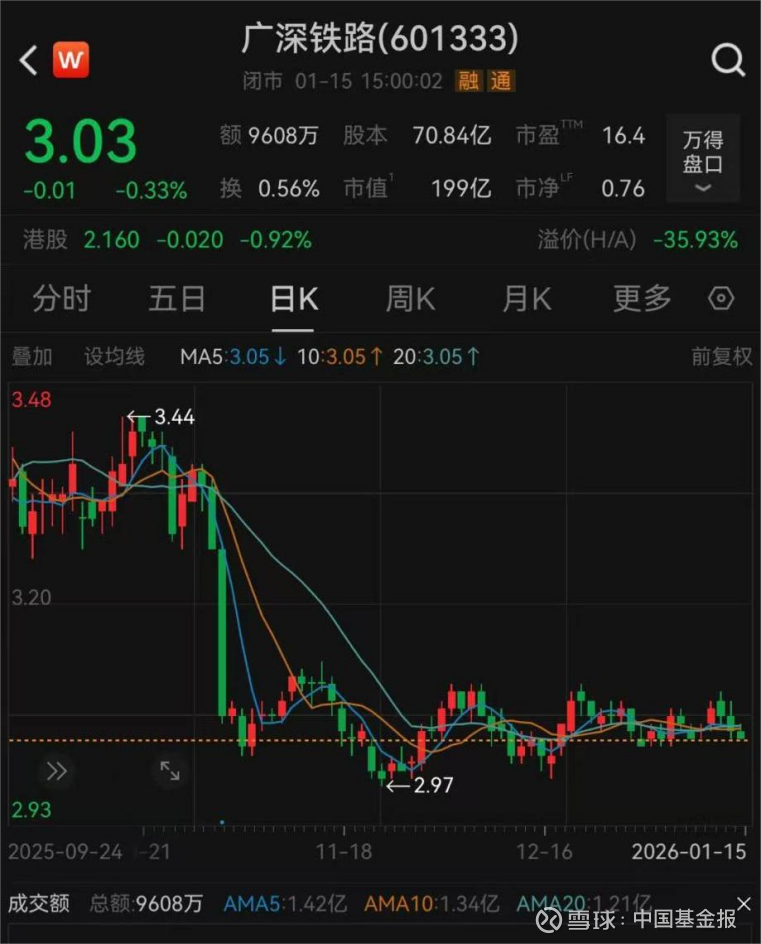 截至1月15日收盘,广深铁路A股报3.03元/股,总市值为199亿元。
