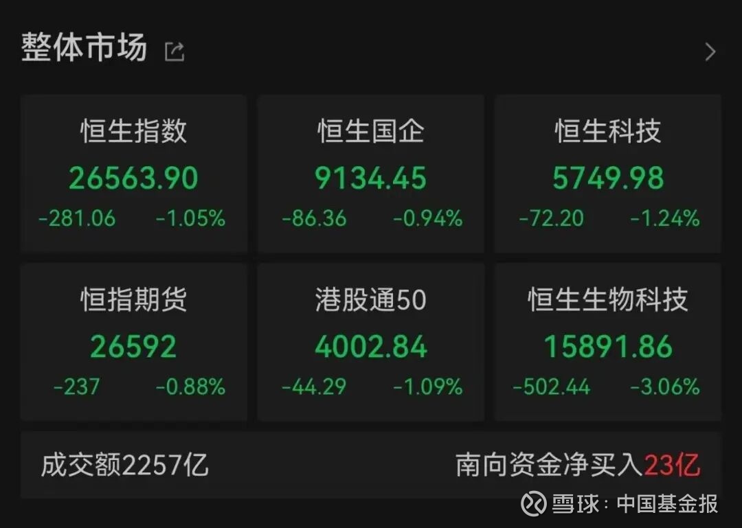 截至收盘,恒生指数跌1.05%,报26563.90点;恒生科技指数跌1.24%,报5749.98点;恒生国企指数跌0.94%,报9134.45点。