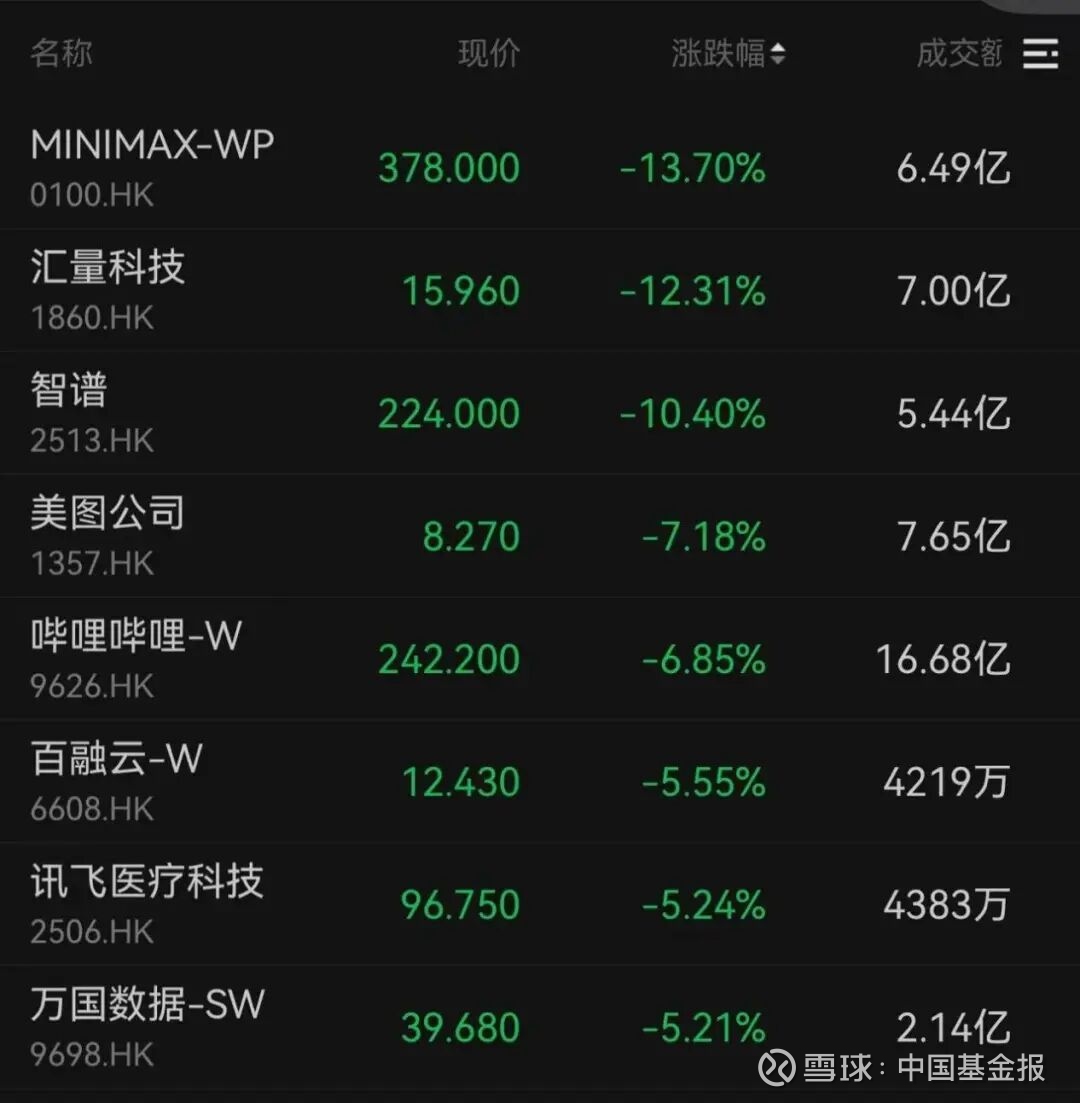 港股市场今日调整,金融和科技股拖累大市。AI应用延续跌势,新股智谱、MINIMAX-WP跌幅较大。