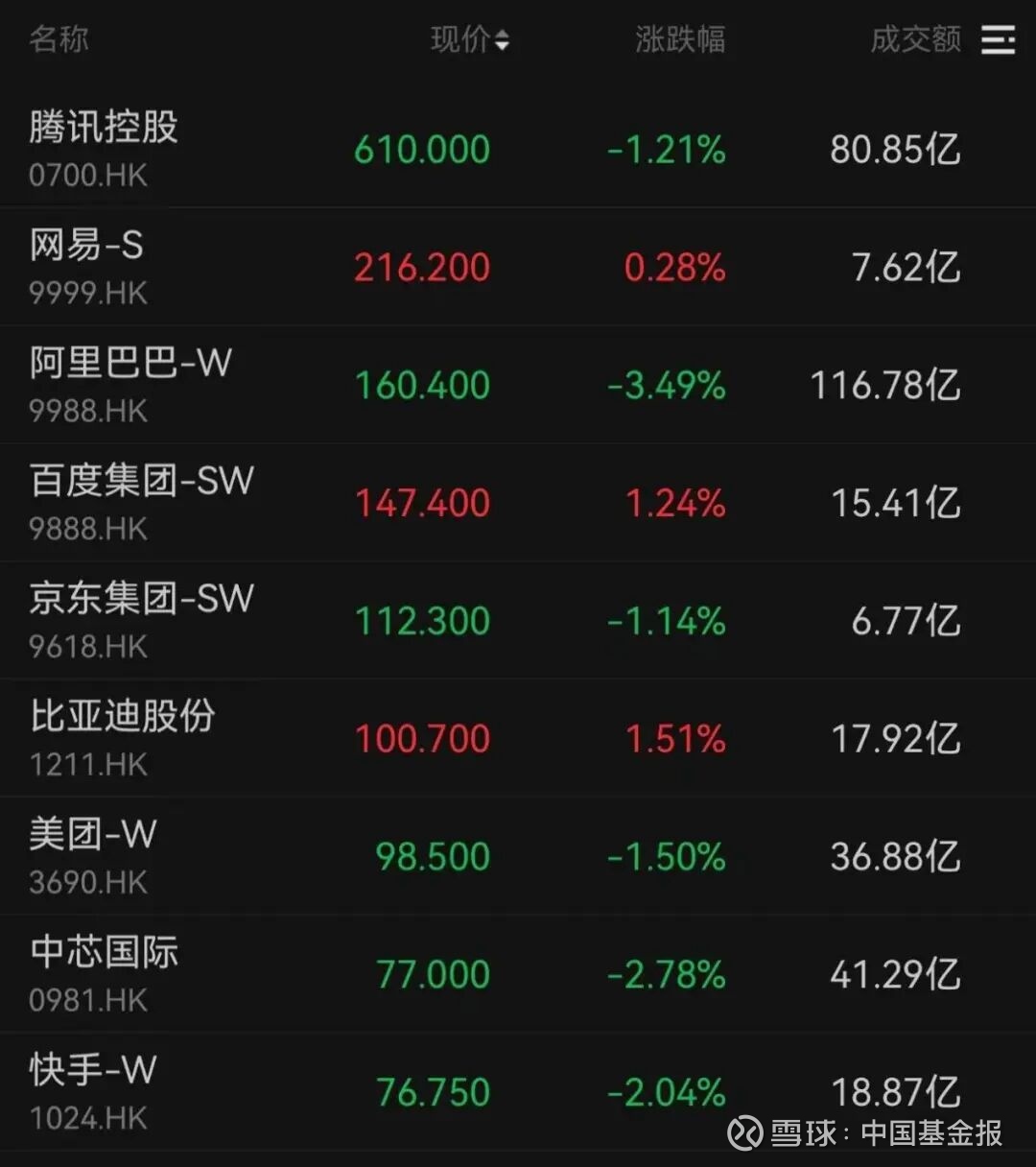 阿里巴巴下跌3.49%,成交额约117亿港元。美团-W、京东集团-SW、腾讯控股均跌超1%。