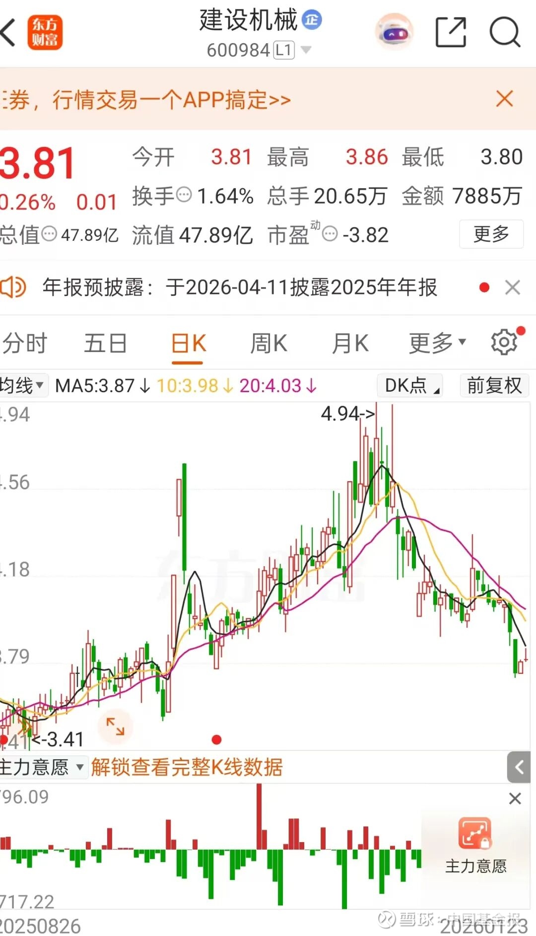 截至1月23日收盘,建设机械报3.81元/股,总市值为47.89亿元。