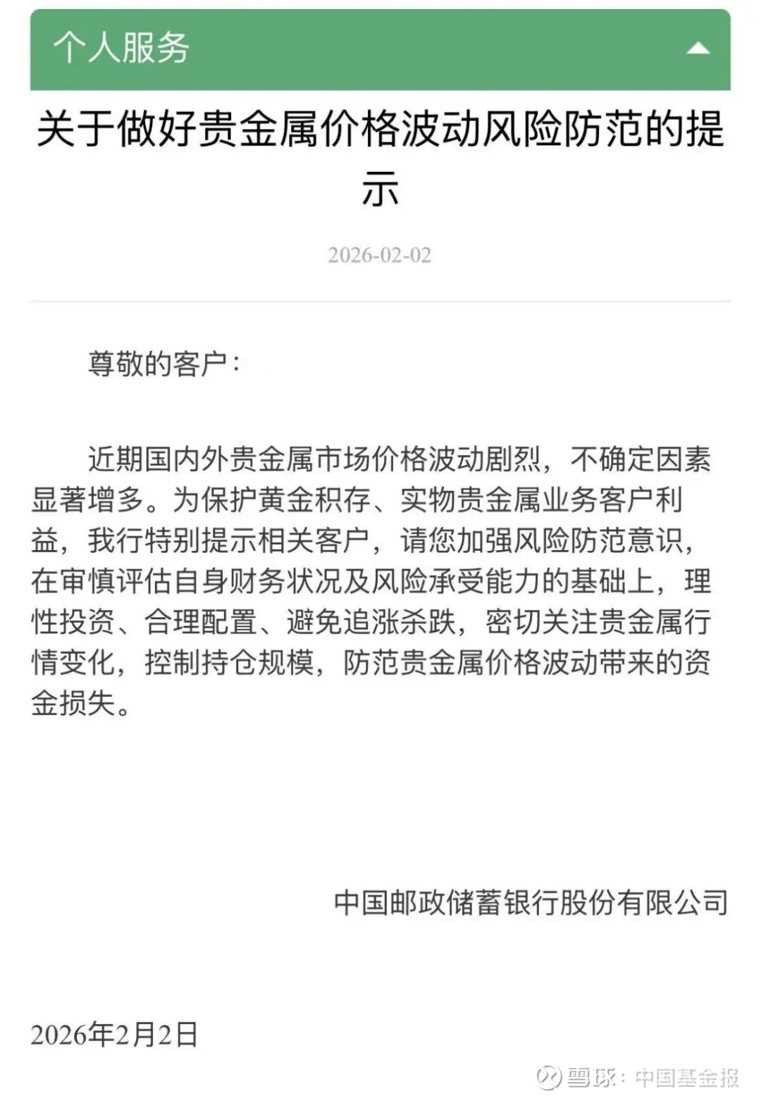 同时,邮储银行发布《关于做好贵金属价格波动风险防范的提示》称,近期国内外贵金属市场价格波动剧烈,不确定因素显著增多。为保护黄金积存、实物贵金属业务客户利益,特别提示相关客户,请加强风险防范意识,在审慎评估自身财务状况及风险承受能力的基础上,理性投资、合理配置、避免追涨杀跌,密切关注贵金属行情变化,控制持仓规模,防范贵金属价格波动带来的资金损失。