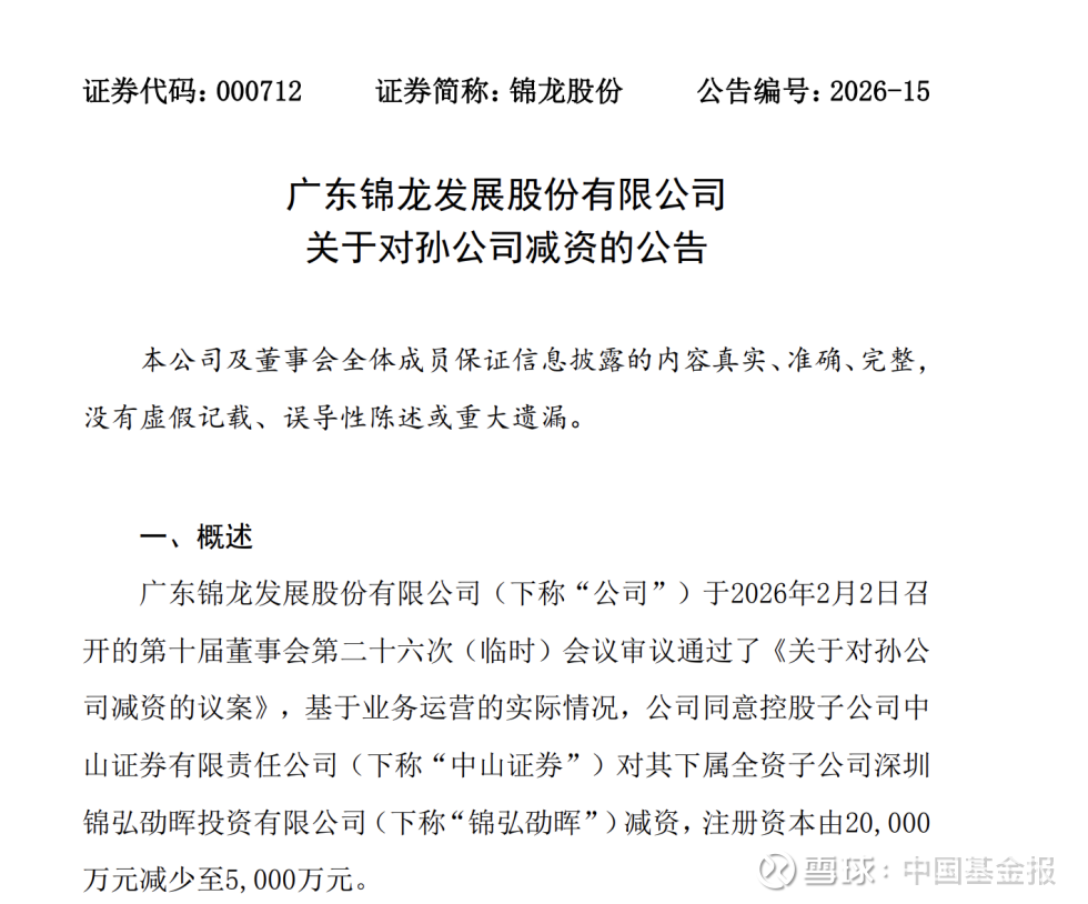 2月2日,锦龙股份密集发布多份公告,披露了副董事长辞职、增补董事、对孙公司减资等多项重要事项。公告显示,锦龙股份同意控股子公司中山证券对其下属全资子公司深圳锦弘劭晖投资有限公司(下称锦弘劭晖)减资,注册资本由2亿元减至5000万元。