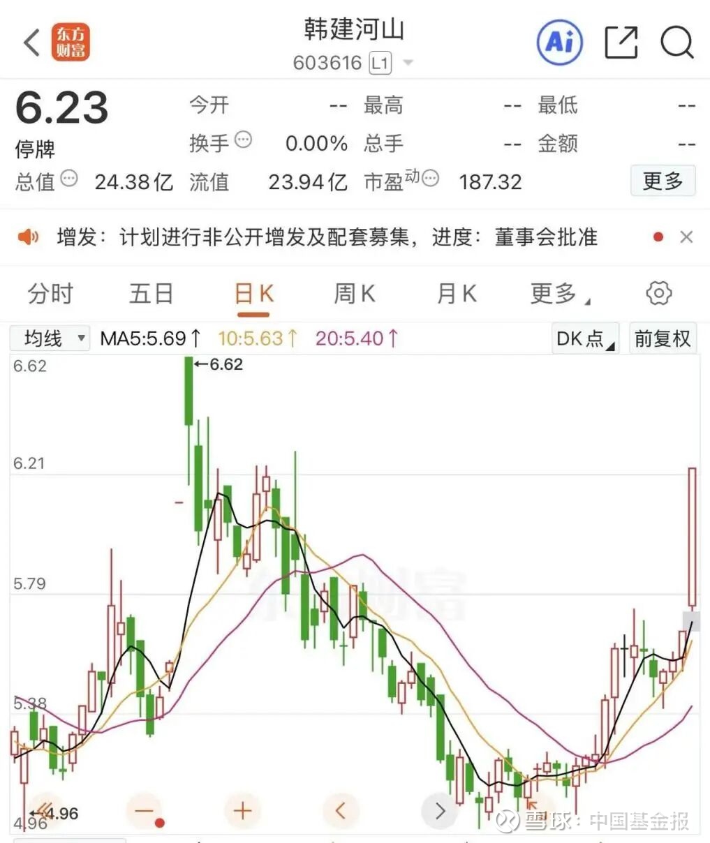 在停牌前一日(即1月20日),韩建河山股价提前涨停。截至当日收盘,韩建河山股价报6.23元/股,涨幅达10.07%,总市值为24.38亿元。