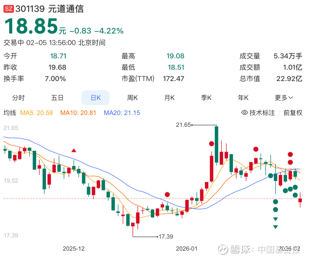 元道通信主业聚焦通信网络维护与优化、通信网络建设等通信技术服务和ICT服务。2月5日,元道通信股价同样出现下跌,截至发稿,报18.85元/股,跌幅超4%。
