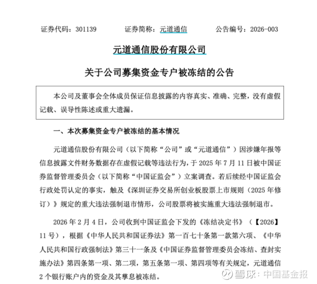 元道通信发布公告称,因涉嫌年报等信息披露文件财务数据存在虚假记载等违法行为,公司于2025年7月11日被证监会立案调查。若后续经证监会行政处罚认定的事实触及相关重大违法强制退市情形,公司股票将被实施重大违法强制退市。