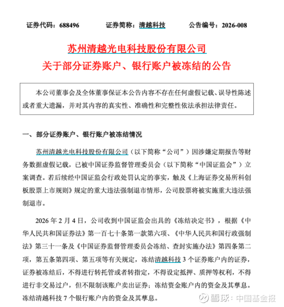 2月4日,公司收到证监会出具的《冻结决定书》,根据有关规定,冻结清越科技3个证券账户内的证券、7个银行账户内的资金及其孳息。