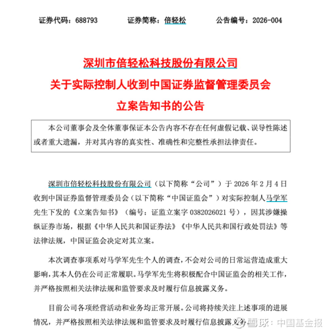 2月5日,倍轻松发布公告称,公司于2月4日收到证监会对公司实际控制人马学军下发的《立案告知书》,因其涉嫌操纵证券市场,根据《中华人民共和国证券法》《中华人民共和国行政处罚法》等法律法规,证监会决定对其立案。