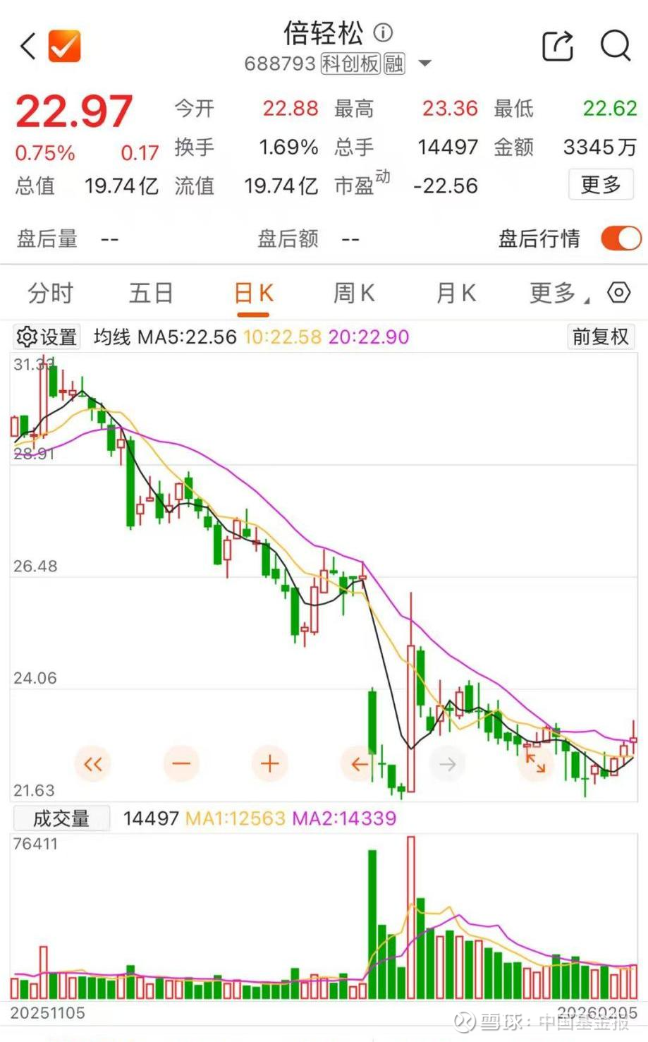 截至2月5日收盘,倍轻松报22.97元/股,上涨0.75%,总市值为19.74亿元。
