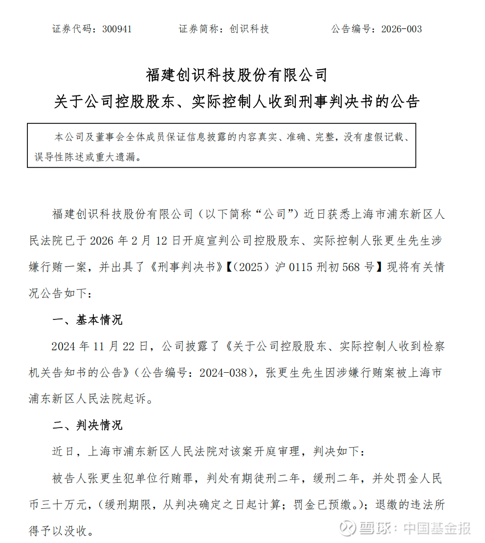 2月13日晚间,创识科技发布公告称,公司控股股东、实际控制人张更生因犯单位行贿罪,被法院一审判处有期徒刑二年,缓刑二年,并处罚金30万元。