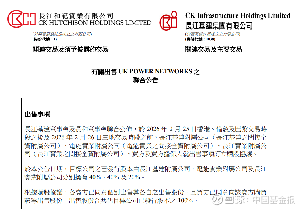 2月26日早间,港股长和、长江基建、长实集团、电能实业等纷纷发布公告,对出售UK POWER NETWORKS(以下简称UKPN)一事进行披露。