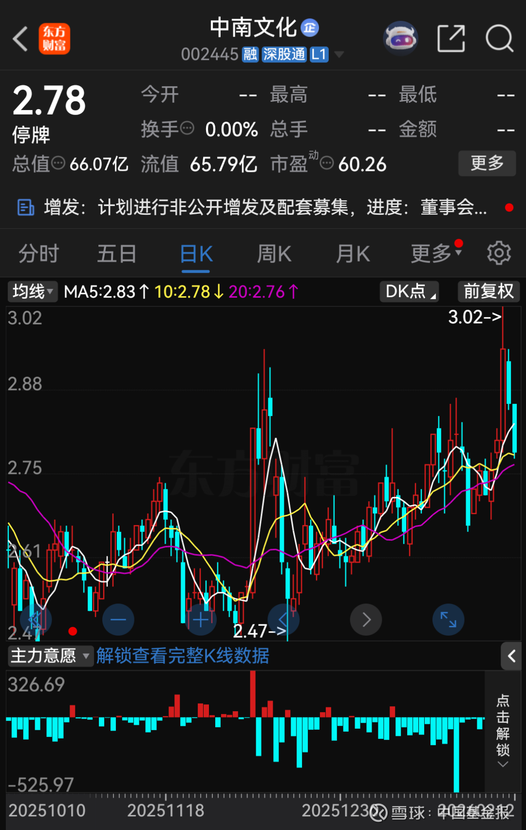 针对上述交易,中南文化自2月13日开市起停牌,计划自3月9日开市起复牌。截至2月12日收盘,中南文化股价报2.78元/股,总市值为66.07亿元。