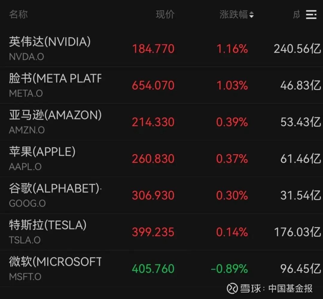 美股科技“七巨头”中,微软下跌0.89%,英伟达、脸书涨超1%,亚马逊、苹果、谷歌、特斯拉均收涨。