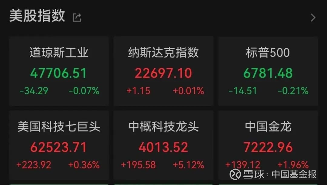 美股三大指数涨跌不一,标普500指数下跌0.21%,道琼斯工业指数下跌0.07%,纳斯达克指数上涨0.01%。