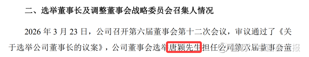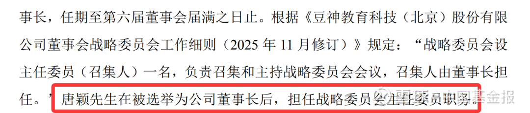 公告显示,2026年3月23日,豆神教育召开第六届董事会第十二次会议,审议通过了《关于选举公司董事长的议案》,公司董事会选举唐颖担任公司第六届董事会董事长,任期至第六届董事会届满之日止。根据相关规定,唐颖在被选举为公司董事长后,担任战略委员会主任委员职务。