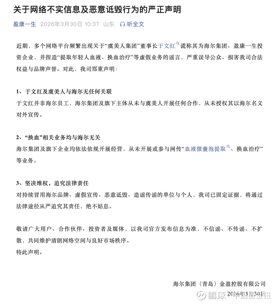 3月30日上午,盈康一生微信公众号发布署名海尔集团(青岛)金盈控股有限公司(以下简称海尔金控)的声明。声明称,近期,多个网络平台频繁出现关于“虞美人集团”董事长于文红谎称其为海尔集团、盈康一生投资企业,并捏造“提取年轻人血液、换血治疗”等虚假业务的谣言,严重误导公众、损害了公司合法权益与品牌声誉。