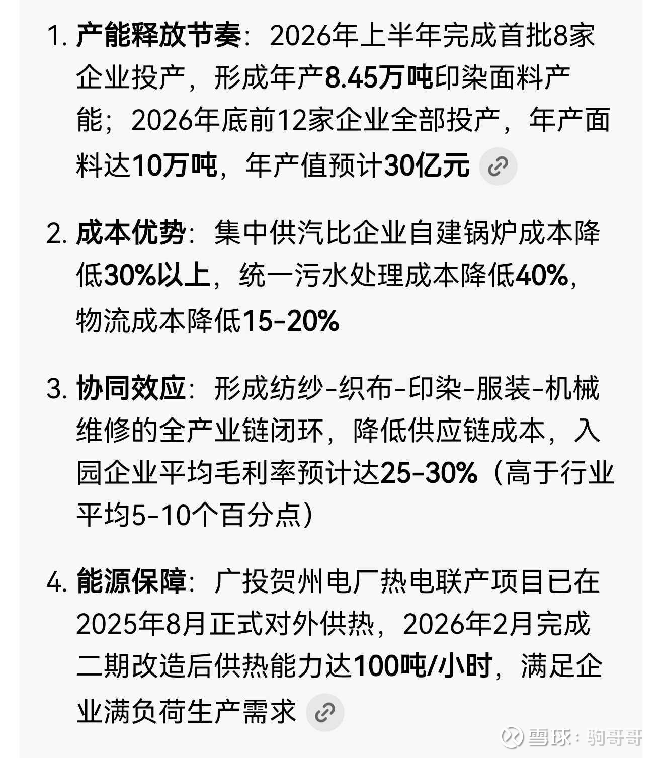 为什么要改造呢?是因为贺州为了承接广东地区产业转移(离广东近)在做一个大型电热绿色园区,贺州仁信热电联产绿色科技园。这个园区主要承接部分印染,纺织产业的转移(需要热能)。而贺州电厂已经在2025年8月重新并网发电,那么在25年四季度,以及26年开始将逐步恢复正常大幅减少火电亏损甚至盈利。园区已经签约12家企业,未来满员30家左右,电厂改造和重新并网供热的时间线,以及园区企业投产的时间线。