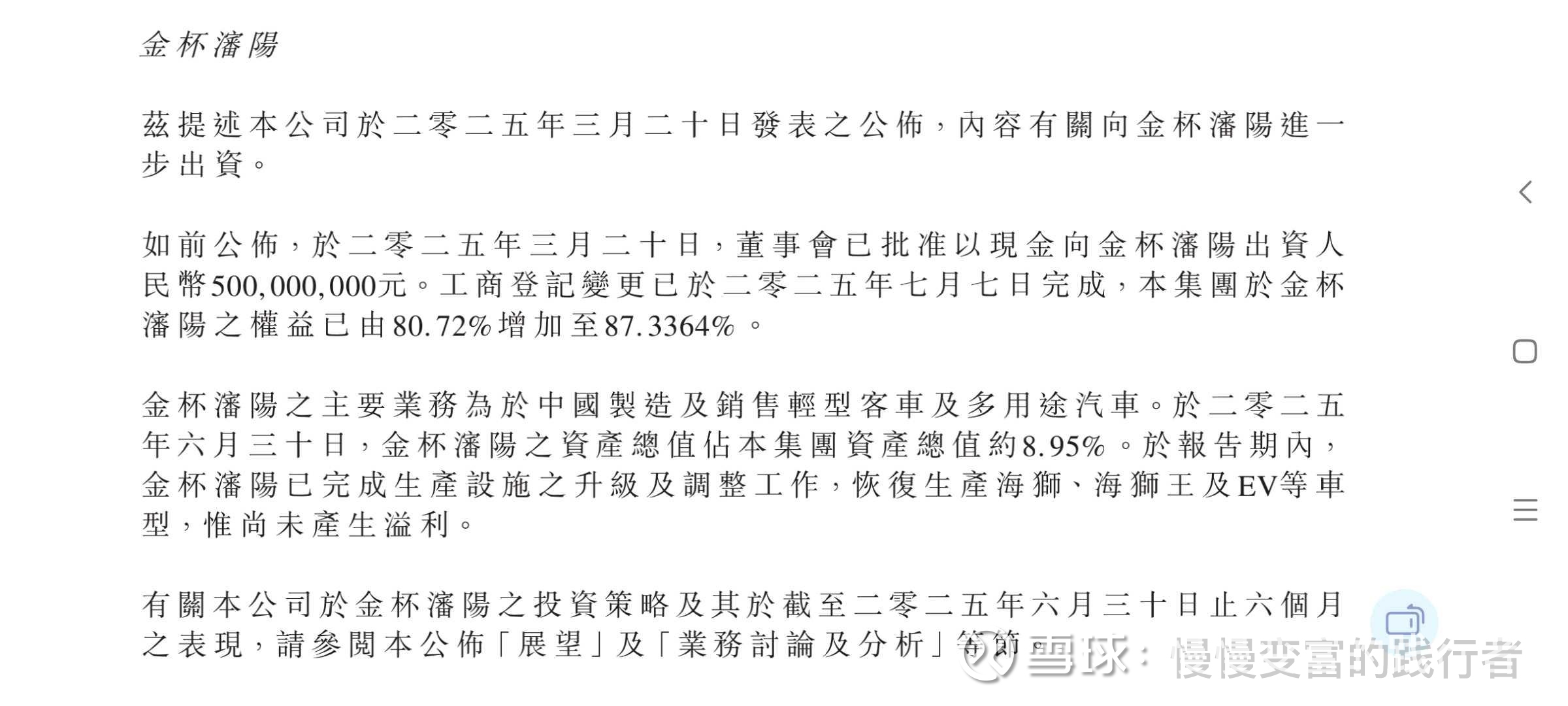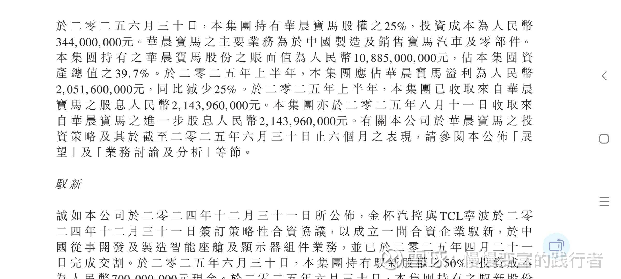所以,从短期分红的角度,也许还能继续特殊分红30亿,而常规分红,也许2026年上半年还能获得华晨宝马的15~20亿,华晨宝马现在好像赚多少就分多少给华晨中国及宝马集团,因为8月分21.43亿,应该是华晨宝马上半年的净利润进行分红,华晨宝马上半年对应华晨集团的25%股份溢利只有20.51亿,这是把华晨宝马老本继续掏出来分红。