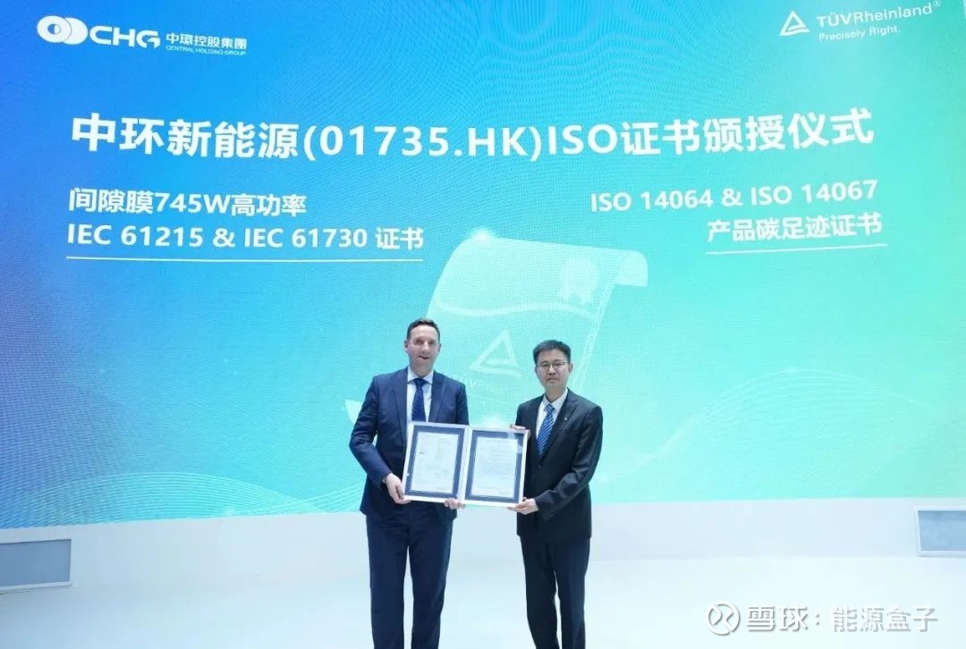 展会现场,德国莱茵TÜV集团大中华区认证部总经理、首席认证官Matthias Grzam为中环新能源(01735.HK)颁发间隙膜745W高功率 IEC 61215 & IEC 61730证书、ISO 14064 & ISO 14067产品碳足迹证书。