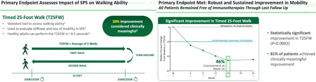 • 主要终点(步行能力):第16周时,患者在25英尺定时步行测试中的时间较基线中位改善了46%。81%的患者改善幅度超过了20%,达到了具有临床意义的改善。