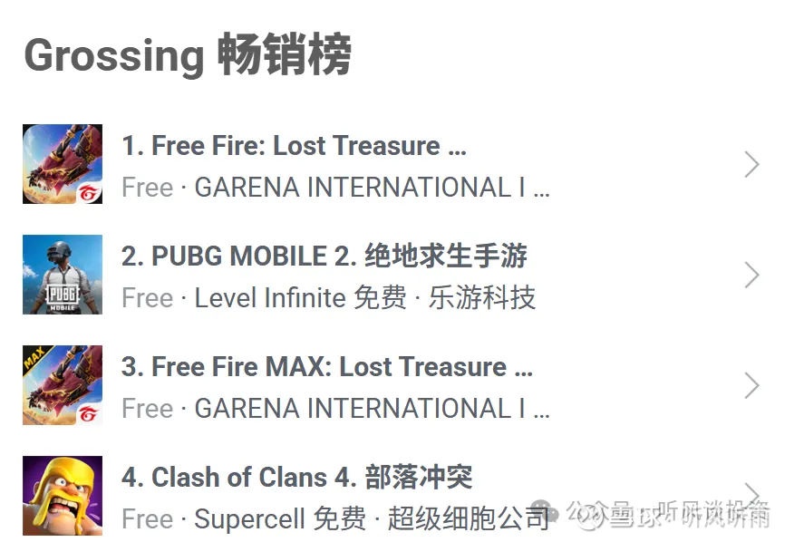 在手机游戏畅销榜,第一和第三是SEA(腾讯持股)的Free Fire,第二是$腾讯控股(00700)$ 的PUBG,第四是腾讯旗下Supercell公司的《部落冲突》。
