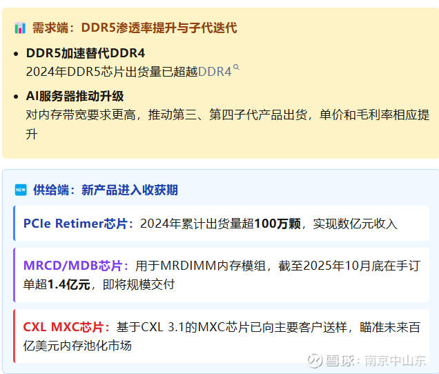 CXL 3.1 MXC 芯片全球首发,较 Alpha Wave 领先约 6 个月,全面支持 64GT/s PCIe 6.0 物理层,带宽较 CXL 2.0 翻倍、延迟更低,适配英伟达 Blackwell、Rubin 等新一代 AI 架构;第四代 DDR5 RCD 芯片规模出货,8800MT/s 速率的 MRCD/MDB 芯片研发进度行业领先。