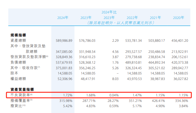 虽然业绩表现较为稳定,但该行资产质量值得关注。截至2024年末,该行不良贷款率为1.72%,较上年末增长0.04个百分点。近三年来,该行的不良贷款率持续增长,2021年至2023年末,不良贷款率由1.15%增长至1.68%,2024年进一步增长。