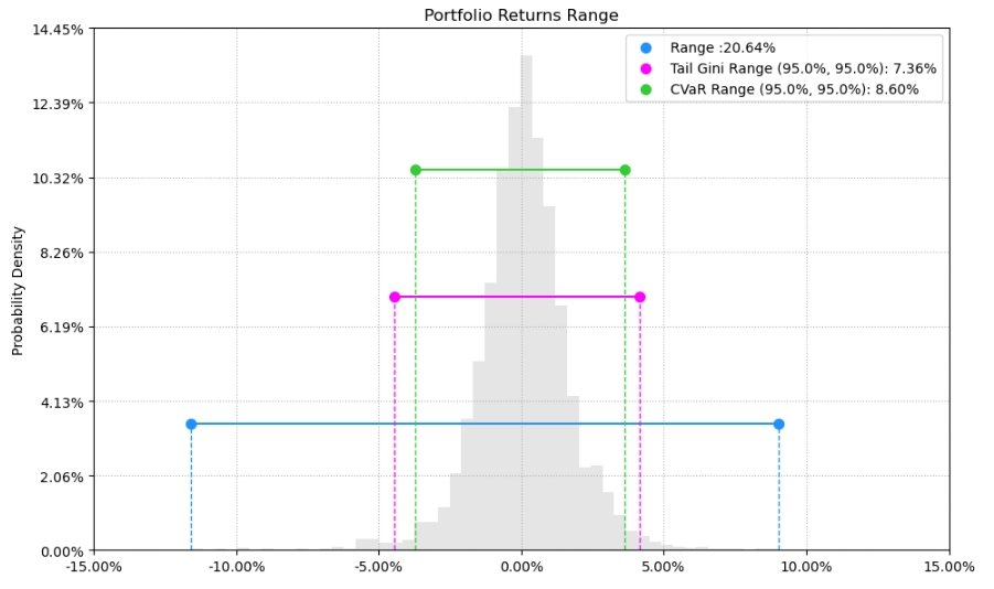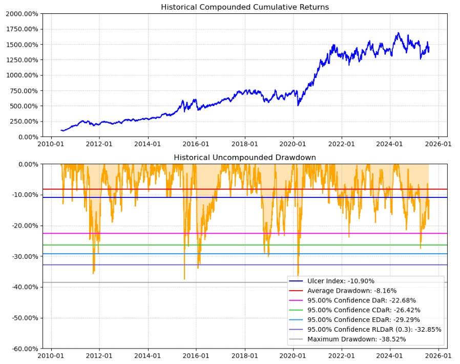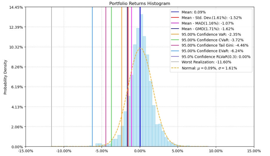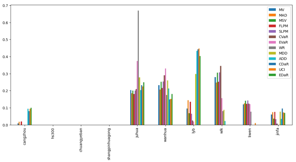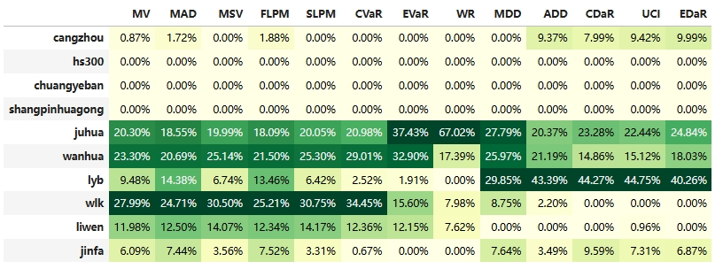 最后看下整个投资组合的情况,日度均值回报在0.09%,比上次测的消费电子行业高10%,相应地8.60%的CVaR波动也会大一些。(注:均值回报看Mean那一栏,越高越好;CVaR波动看CVaR那一栏,越低越好)