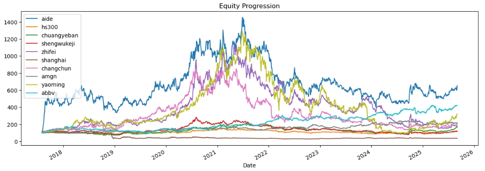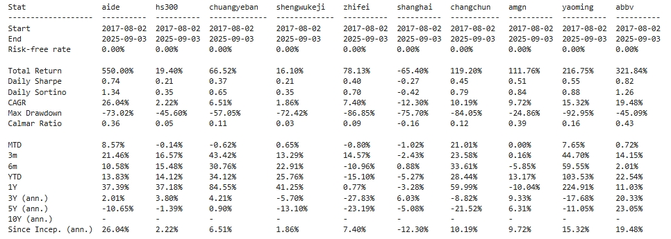艾德生物,基本面优秀,历史表现一骑绝尘,目前估值也低,建议重点关注。整个生物科技行业历史表现不错,波动不大,综合夏普比率很有性价比,建议重点关注,首选艾伯维,其次艾德生物。(注:夏普比率越高越好)