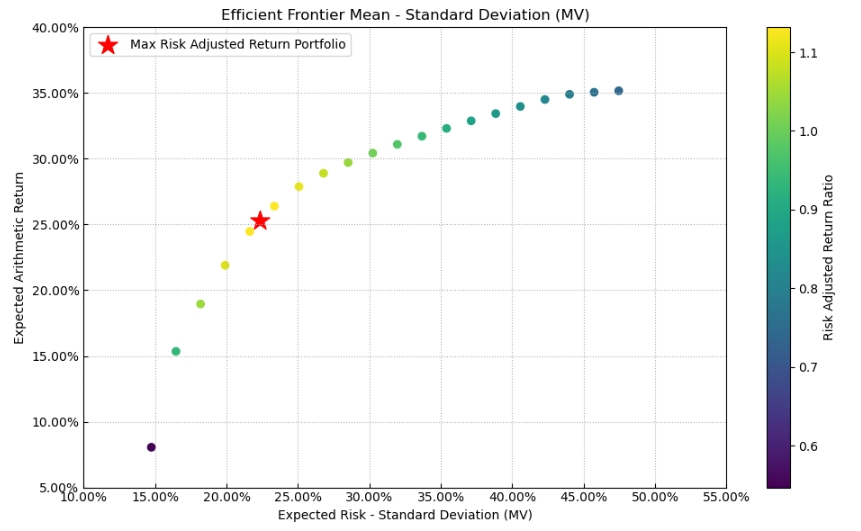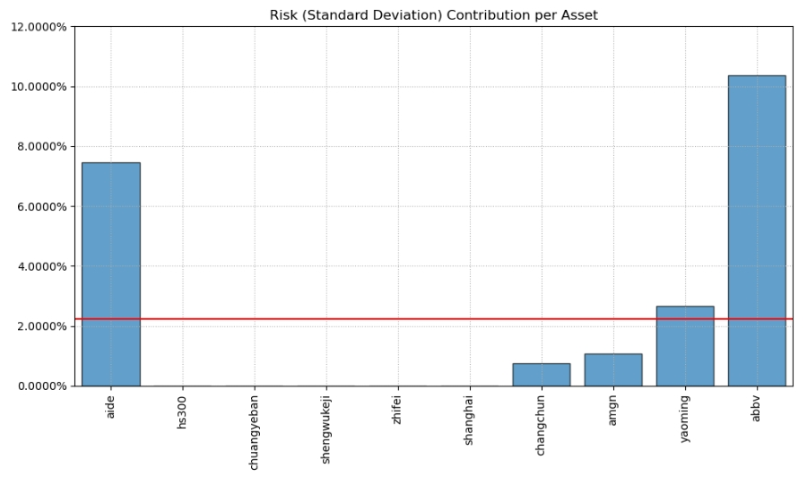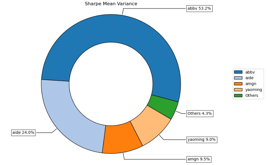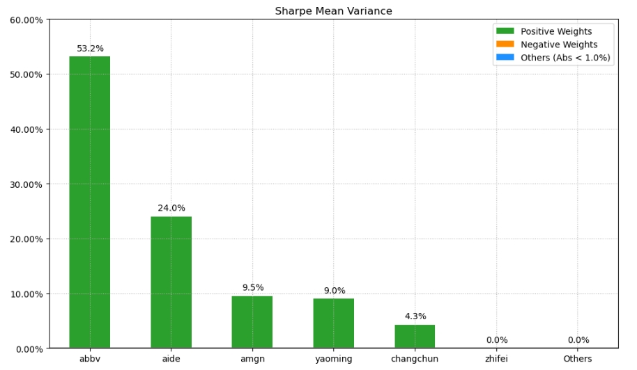 按最高夏普比率配置的话,系统给的权重为24.0%,最高权重给了美股的艾伯维占比53.2%。(注:占比越高越好)