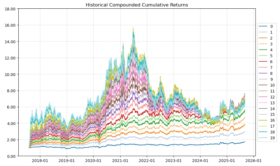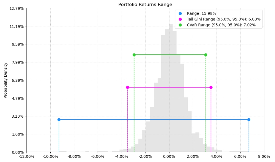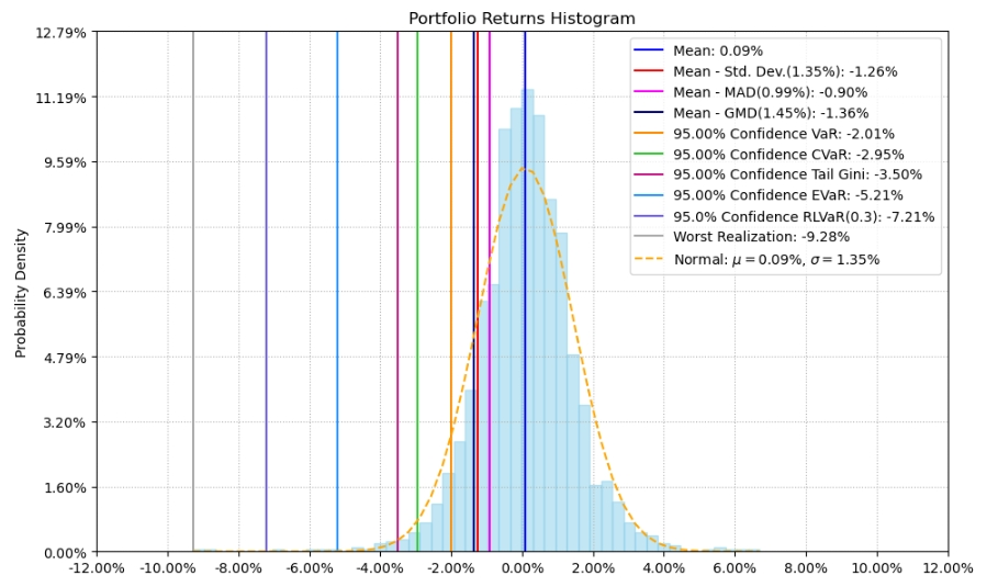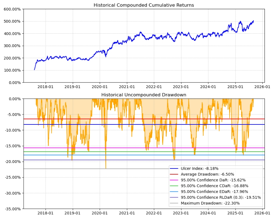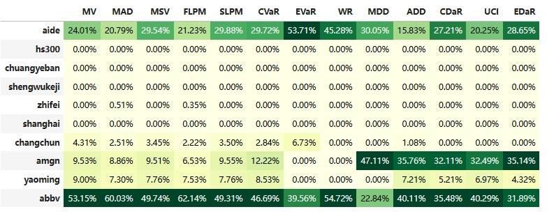 最后看下整个投资组合的情况,日度均值回报在0.09%,比上次测的工业机械行业低40%,相应地7.02%的CVaR波动也会小很多。(注:均值回报看Mean那一栏,越高越好;CVaR波动看CVaR那一栏,越低越好)