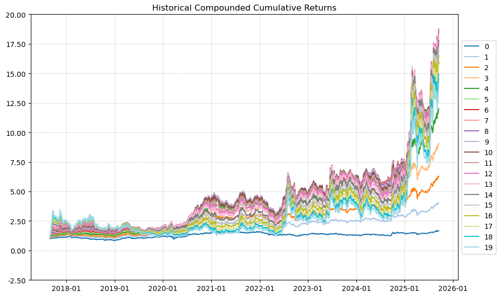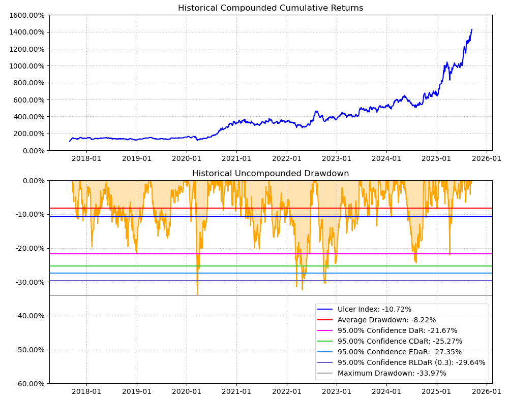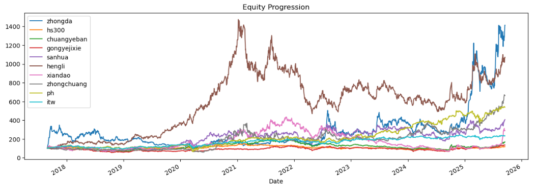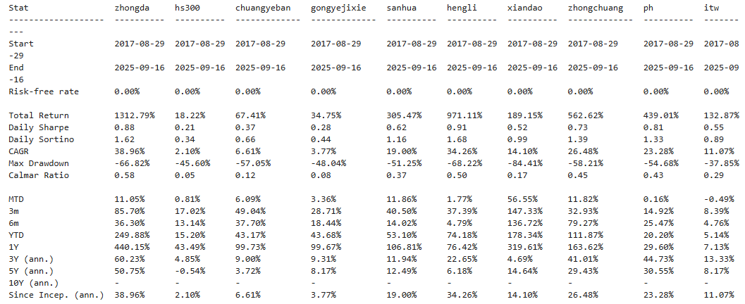 区间累计回报近16倍,最大回撤33.97%,投资组合的整体表现要好于中大力德个股。整个工业机械行业盈利能力相当不错,波动中高,夏普比率1.42凤毛麟角般的存在。(注:累计回报看Cumulative Returns那一栏,越高越好;最大回撤看Maximum Drawdown那一栏,越低越好)