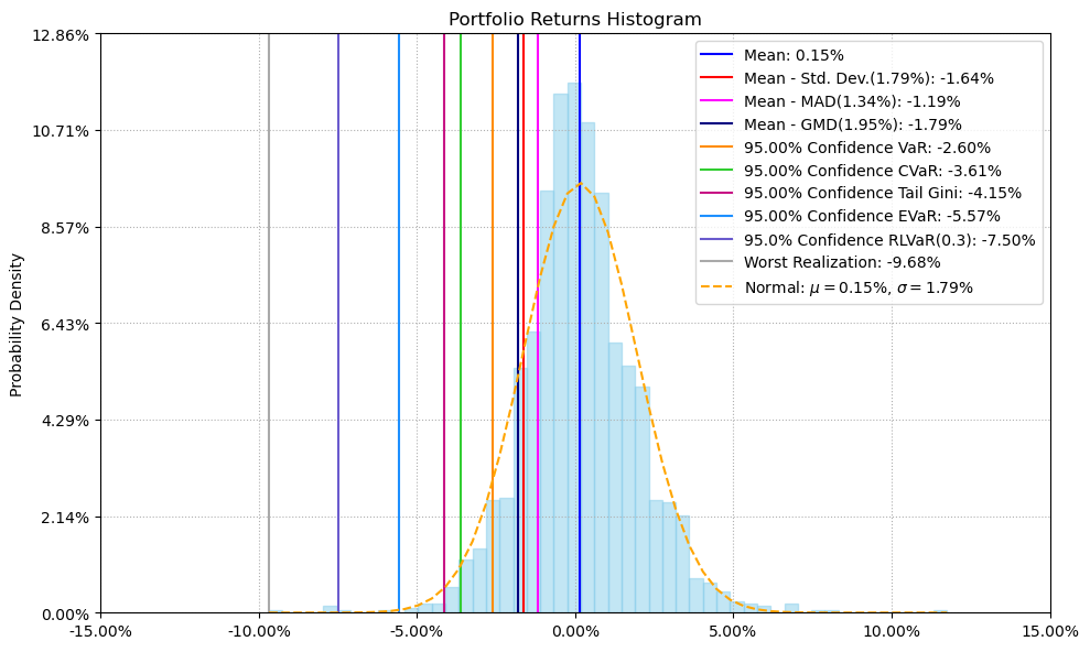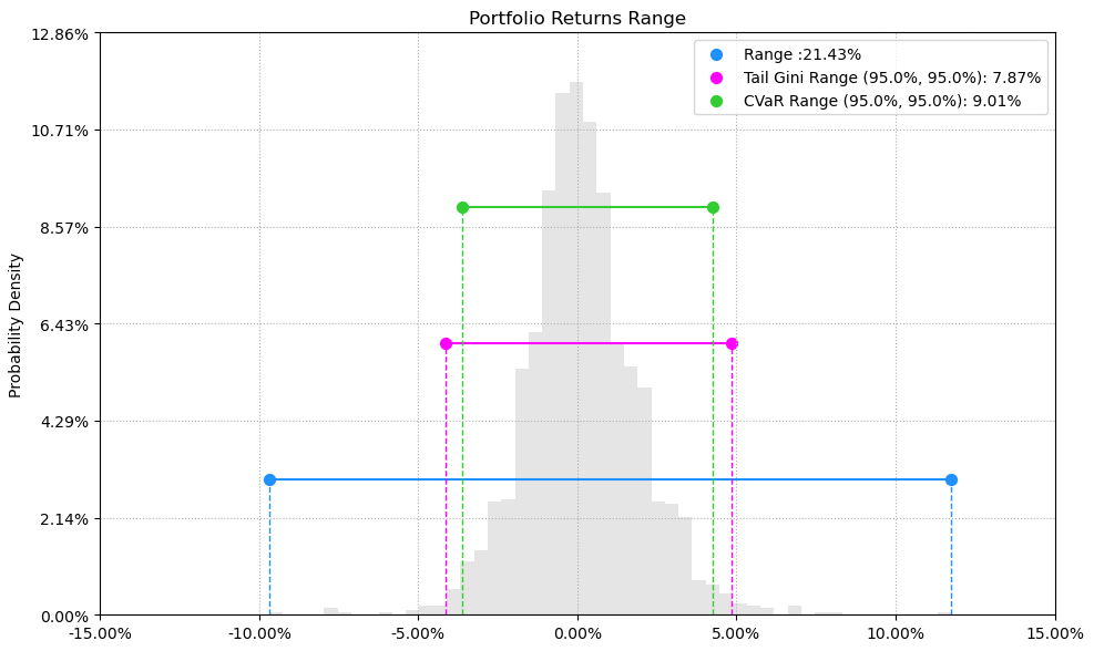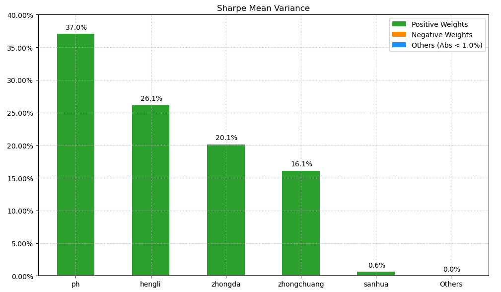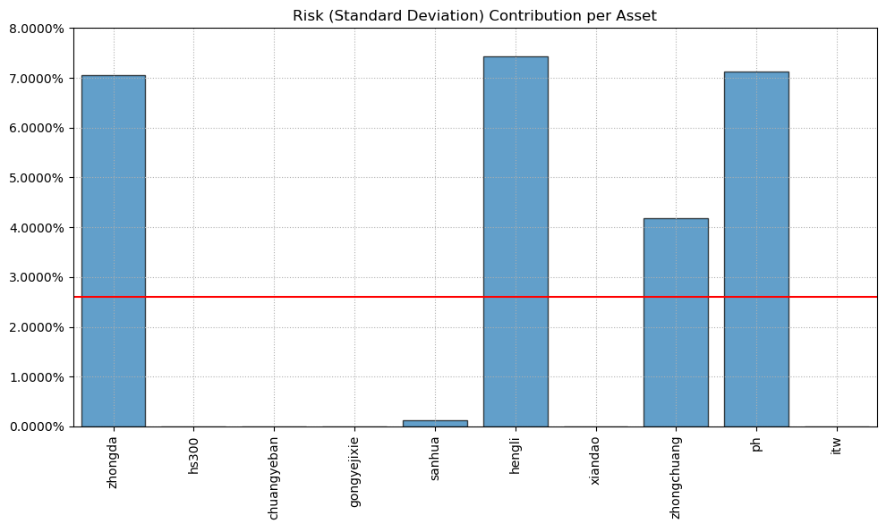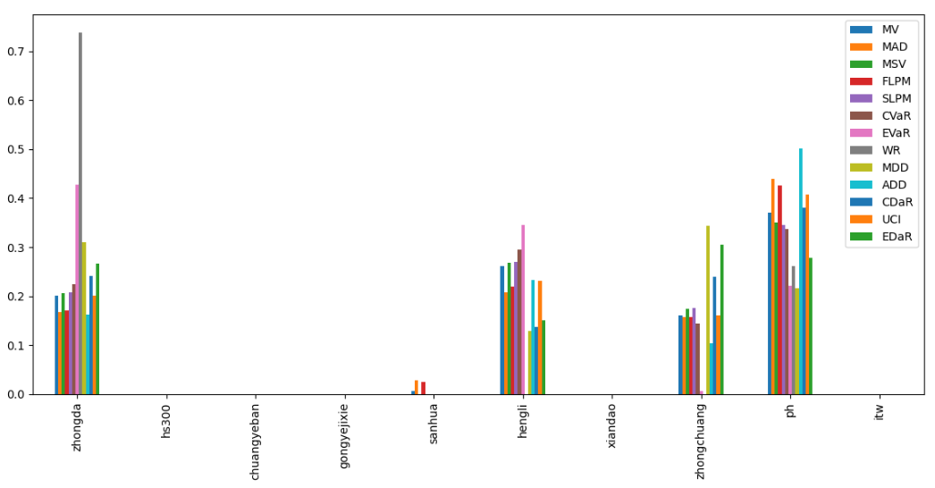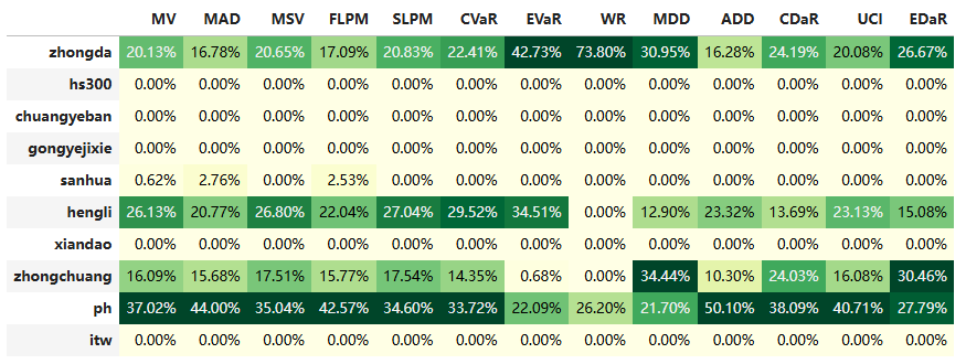 最后看下整个投资组合的情况,日度均值回报在0.15%,跟上次测的集成电路行业高50%,相应地9.01%的CVaR波动也会大一些。(注:均值回报看Mean那一栏,越高越好;CVaR波动看CVaR那一栏,越低越好)