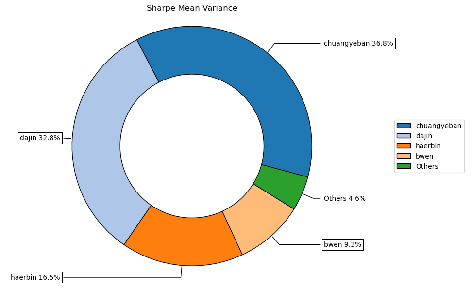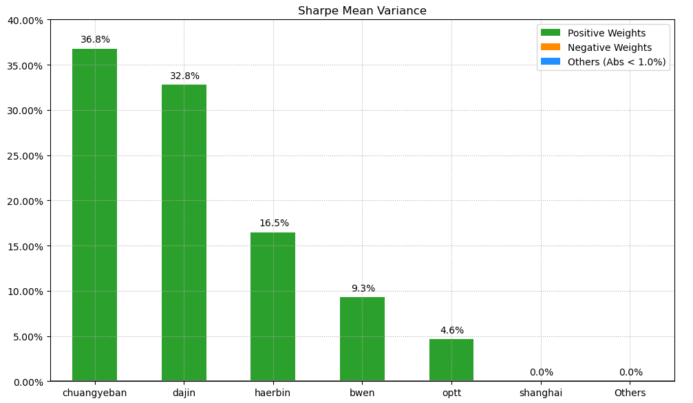 按最高夏普比率配置的话,系统给的权重为0,最高权重给了大金重工占比32.8%。(注:占比越高越好)