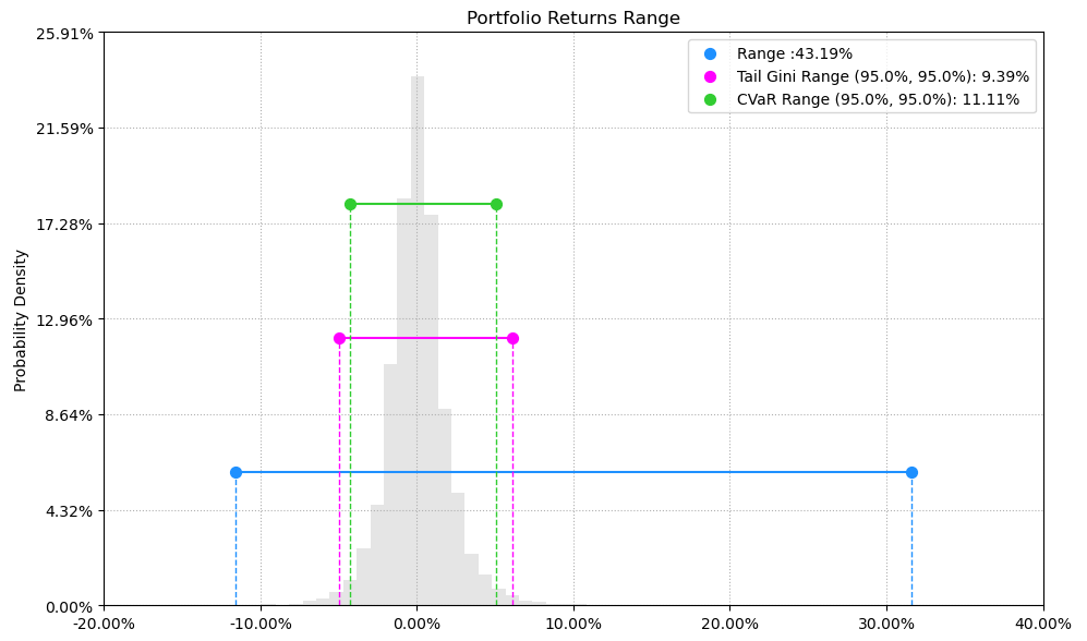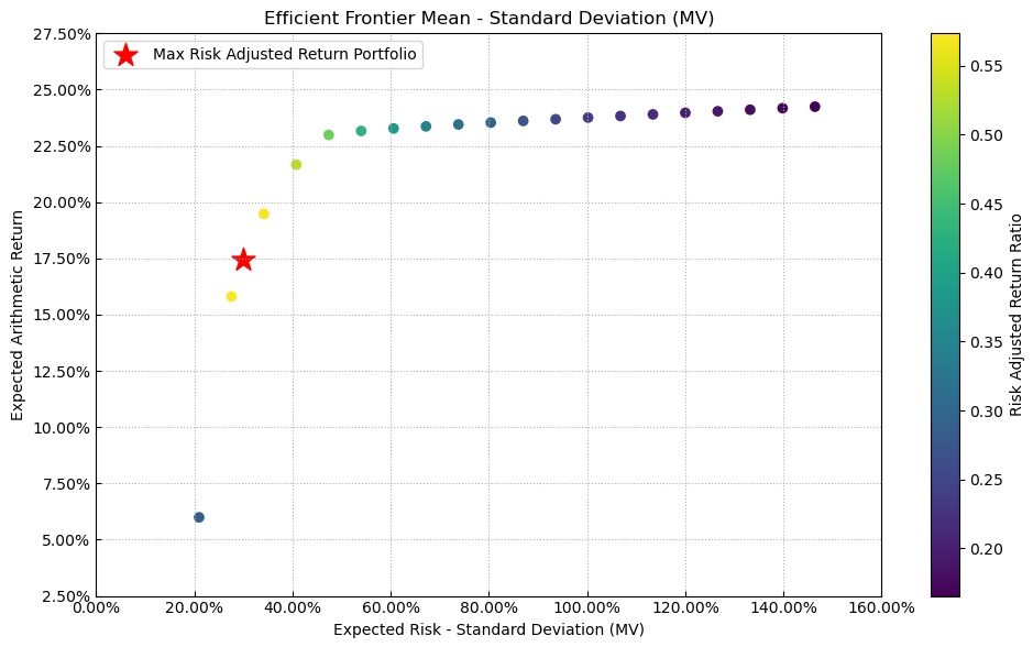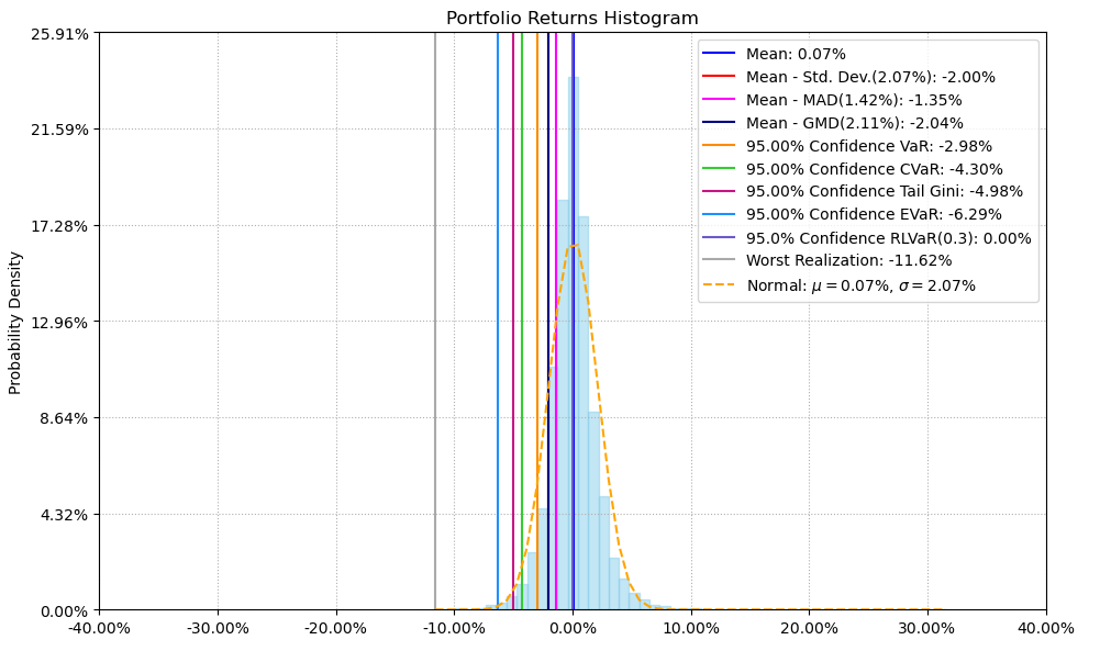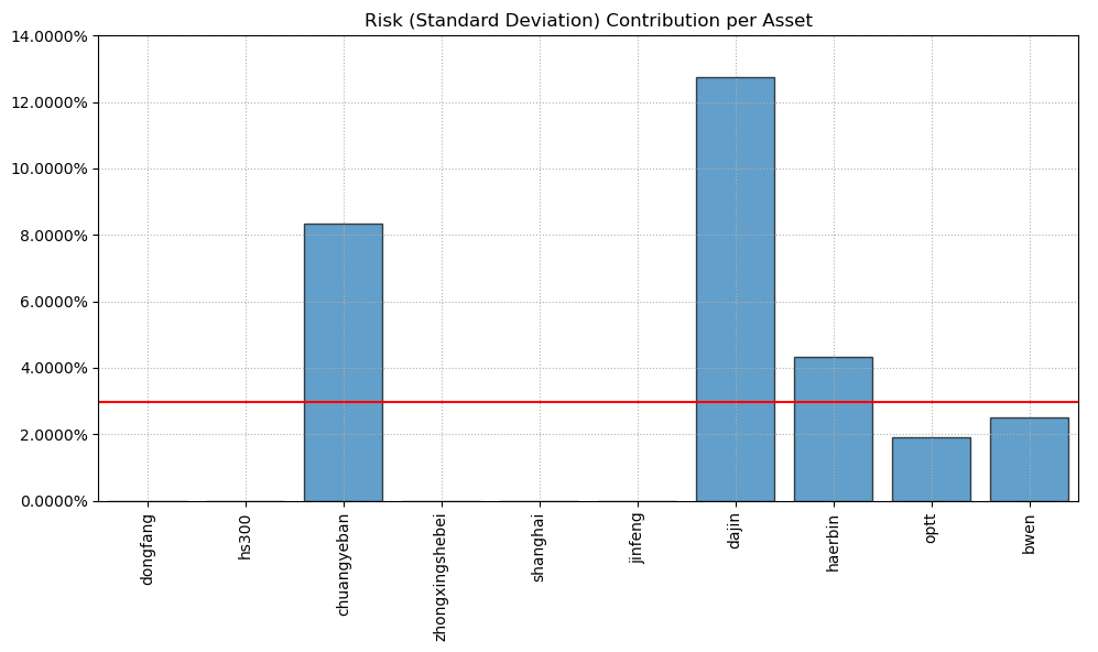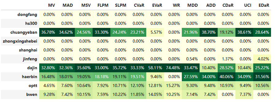 最后看下整个投资组合的情况,日度均值回报在0.07%,比上次测的金属非金属行业低20%,而且11.11%的CVaR波动反而还更大你敢信。(注:均值回报看Mean那一栏,越高越好;CVaR波动看CVaR那一栏,越低越好)