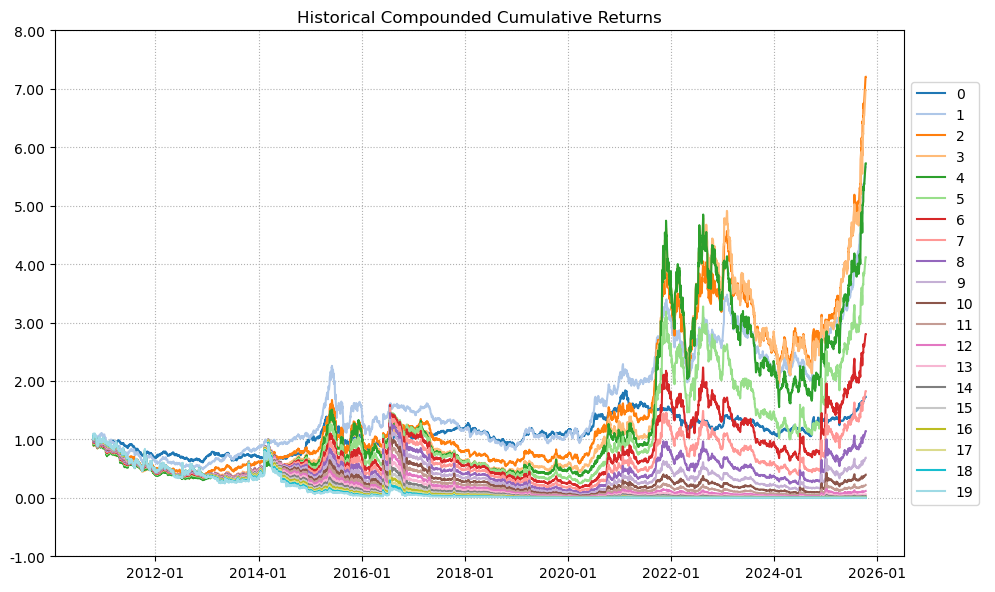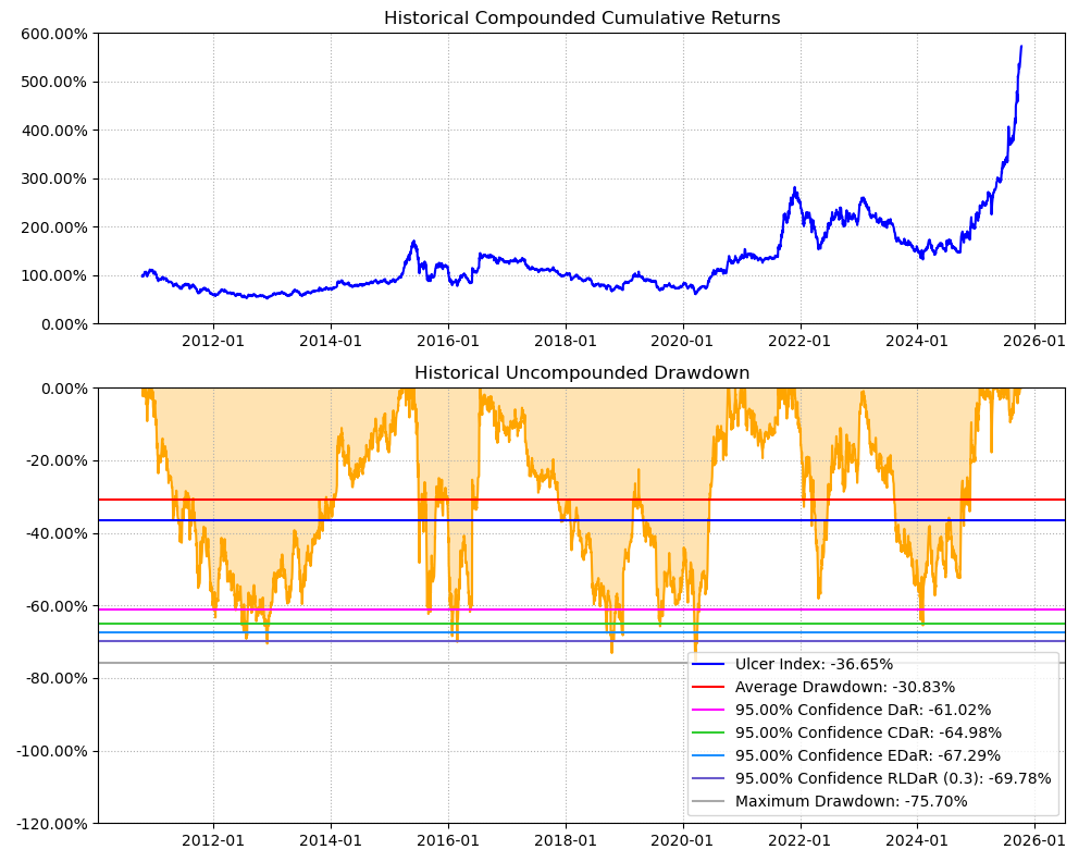 区间累计回报近6倍,最大回撤75.70%,投资组合的整体表现要好于东方电气个股。整个重型设备行业盈利能力一般,波动还极大,夏普比率0.58触目惊心。(注:累计回报看Cumulative Returns那一栏,越高越好;最大回撤看Maximum Drawdown那一栏,越低越好)
