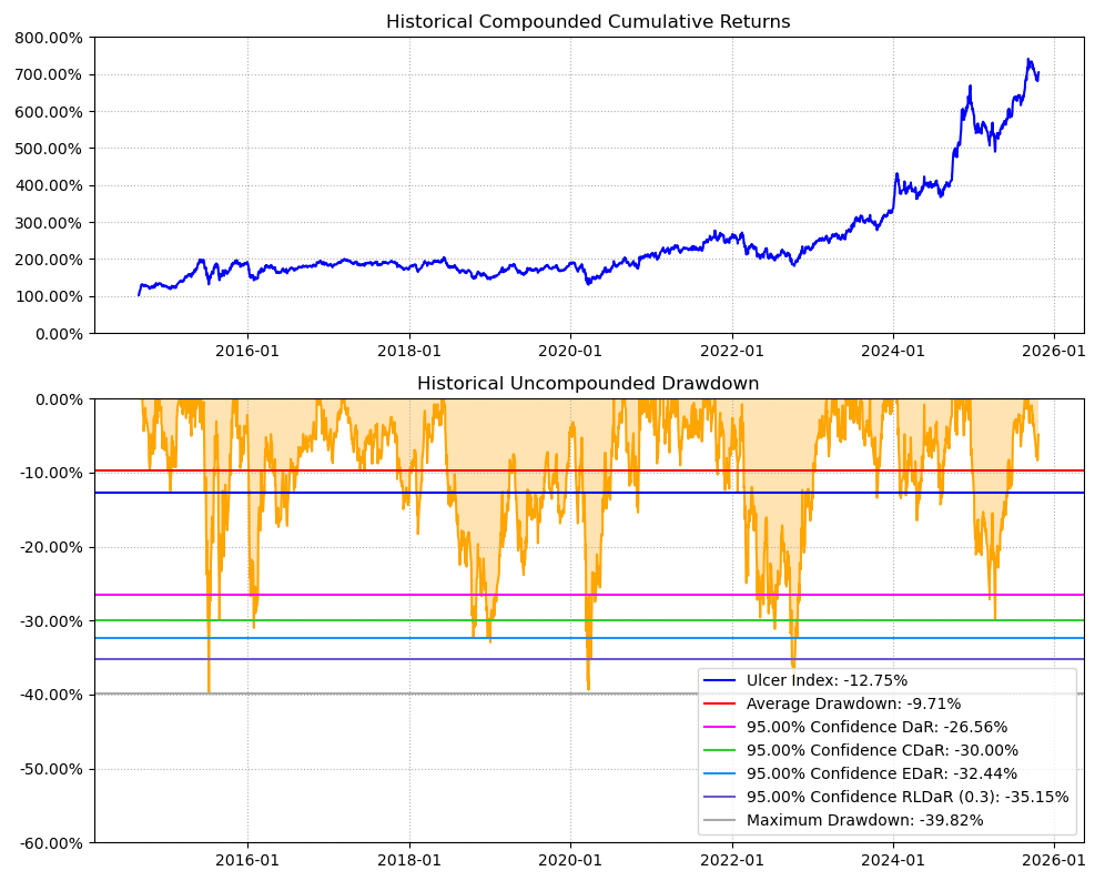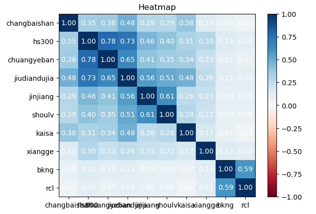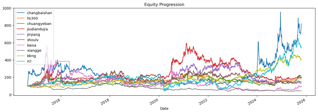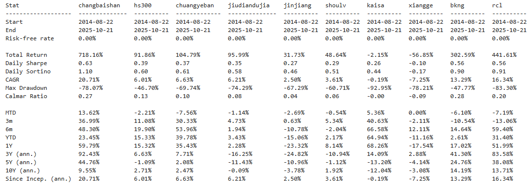 区间累计回报近8倍,最大回撤39.82%,投资组合的整体表现要好于长白山个股。整个酒店度假行业盈利能力还行,波动偏大,夏普比率0.87表现一般。(注:累计回报看Cumulative Returns那一栏,越高越好;最大回撤看Maximum Drawdown那一栏,越低越好)