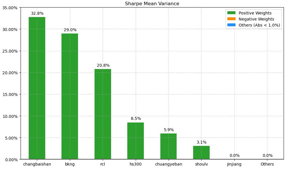 按最高夏普比率配置的话,系统给的权重为32.8%,占据最高权重,其次给了美股的BOOKING占比29.0%。(注:占比越高越好)