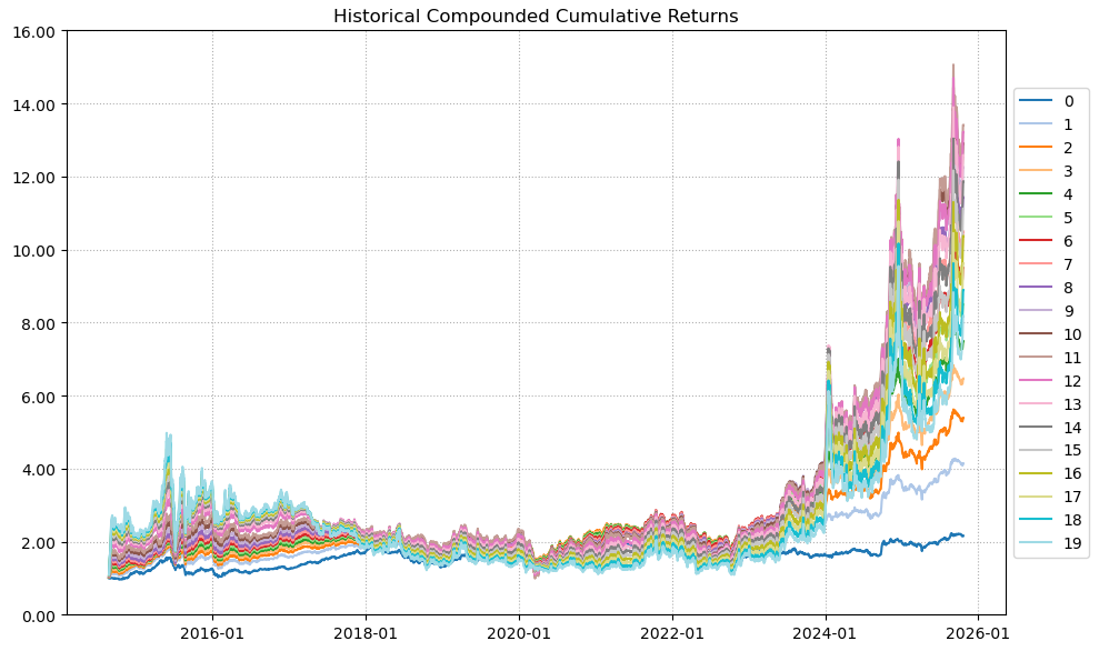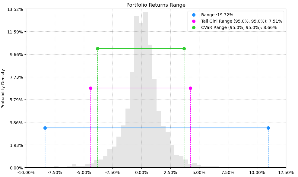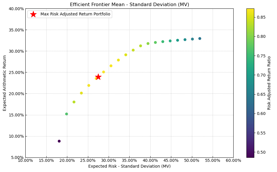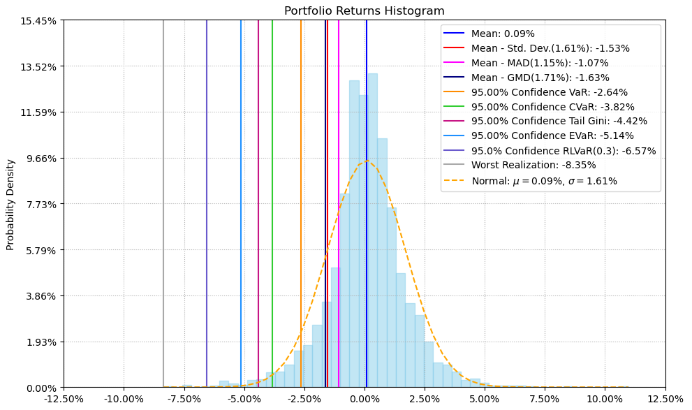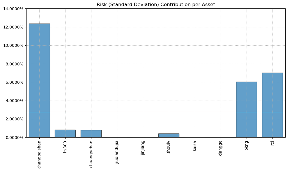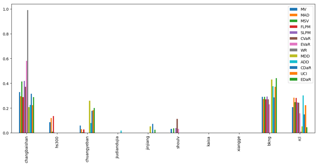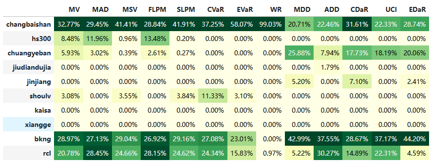 最后看下整个投资组合的情况,日度均值回报在0.09%,跟上次测的电子设备行业差不多,不过8.66%的CVaR波动要更大些。(注:均值回报看Mean那一栏,越高越好;CVaR波动看CVaR那一栏,越低越好)