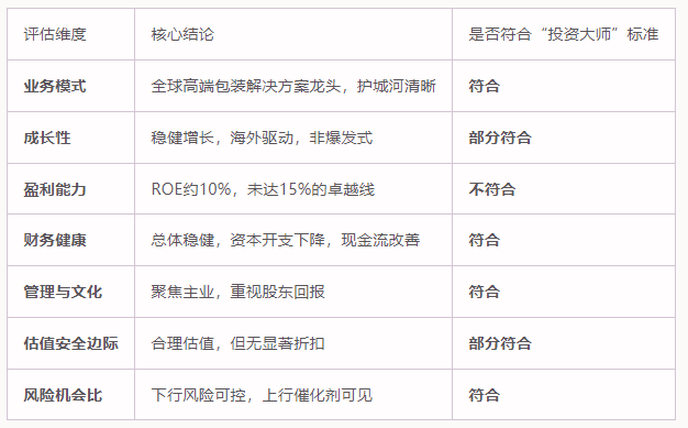 裕同科技所处的包装行业商业模式清晰,其发展逻辑与消费电子、日常消费品等强相关,相对容易理解。然而,公司业务已深度全球化,涉及多国运营和汇率管理,这对投资者的跟踪判断能力提出了更高要求。其近期的净资产收益率(ROE)在10%左右,距离设定的“持续高于15%”的标准尚有差距。因此,除非对全球制造业和包装行业有深刻洞察,否则判断其未来多年ROE保持在15%以上的把握难以达到90%。